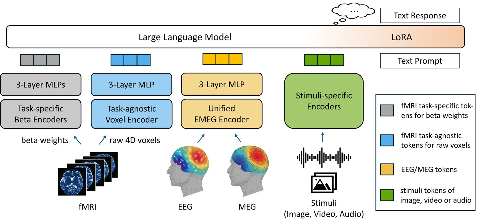 Deciphering brain function through non-invasive recordings requires synthesizing complementary high-frequency electromagnetic (EEG/MEG) and low-frequency metabolic (fMRI) signals. However, despite their shared neural origins, extreme discrepancies have traditionally confined these modalities to isolated analysis pipelines, hindering a holistic interpretation of brain activity. To bridge this fragmentation, we introduce \textbf{NOBEL}, a \textbf{n}euro-\textbf{o}mni-modal \textbf{b}rain-\textbf{e}ncoding \textbf{l}arge language model (LLM) that unifies these heterogeneous signals within the LLM's semantic embedding space. Our architecture integrates a unified encoder for EEG and MEG with a novel dual-path strategy for fMRI, aligning non-invasive brain signals and external sensory stimuli into a shared token space, then leverages an LLM as a universal backbone. Extensive evaluations demonstrate that NOBEL serves as a robust generalist across standard single-modal tasks. We also show that the synergistic fusion of electromagnetic and metabolic signals yields higher decoding accuracy than unimodal baselines, validating the complementary nature of multiple neural modalities. Furthermore, NOBEL exhibits strong capabilities in stimulus-aware decoding, effectively interpreting visual semantics from multi-subject fMRI data on the NSD and HAD datasets while uniquely leveraging direct stimulus inputs to verify causal links between sensory signals and neural responses. NOBEL thus takes a step towards unifying non-invasive brain decoding, demonstrating the promising potential of omni-modal brain understanding.