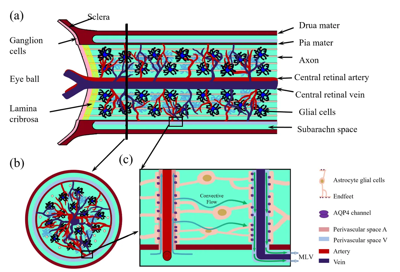 Effective metabolic waste clearance and maintaining ionic homeostasis are essential for the health and normal function of the central nervous system. To understand its mechanism and the role of fluid flow, we develop a multidomain electro-osmotic model of optic-nerve microcirculation that couples hydrostatic and osmotic fluid transport with electro-diffusive solute movement across axons, glia, the extracellular space, and arterial/venous/capillary perivascular spaces. Cerebrospinal fluid enters the optic nerve via the arterial parivascular space, passes both the glial and ECS before exiting through the venous parivascular space. Exchanges across astrocytic endfeet are essential and they occur in two distinct and coupled paths: through AQP4 on glial membranes and gaps between glial endfeet, thus establishing a mechanistic substrate for two modes of glymphatic transport, at rest and during stimulus-evoked perturbations. Parameter sweeps show that lowering AQP4-mediated fluid permeability or PVS permeability elevates pressure, suppresses radial exchange and slows clearance, effects most pronounced for solutes reliant on PVS V export. The model reproduces baseline and stimulus-evoked flow and demonstrates that PVS-mediated export is the primary clearance route for both small and moderate solutes. Small molecules clear faster because rapid ECS diffusion broadens their distribution and enhances ECS PVS exchange, whereas moderate species have low ECS diffusivity, depend on transendfoot transfer, and clear more slowly via PVS V convection. Our framework can also be used to explain the sleep-wake effect mechanistically: enlarging ECS volume or permeability increases transinterface flux and accelerates waste removal.