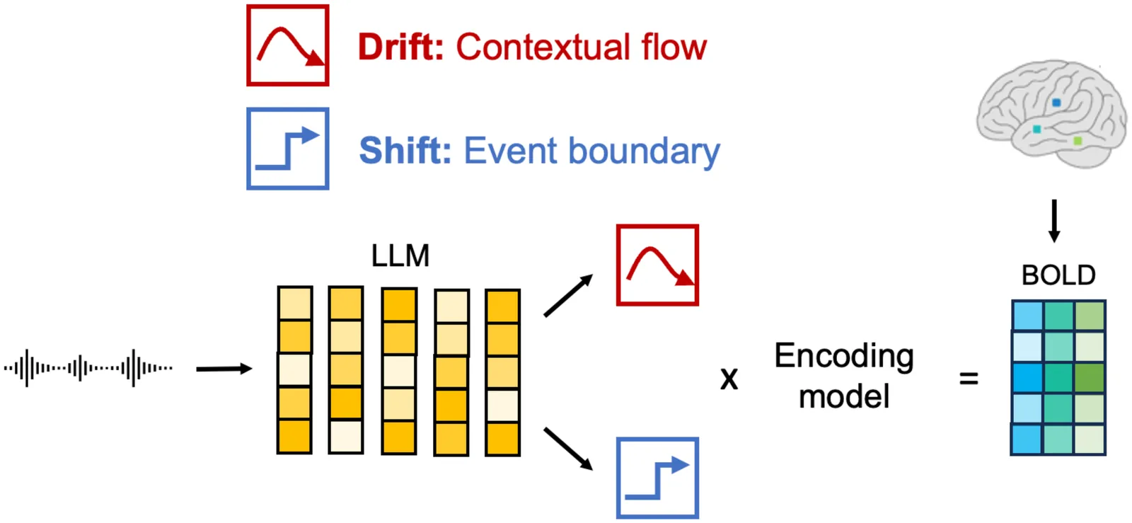 Coherence in language requires the brain to satisfy two competing temporal demands: gradual accumulation of meaning across extended context and rapid reconfiguration of representations at event boundaries. Despite their centrality to language and thought, how these processes are implemented in the human brain during naturalistic listening remains unclear. Here, we tested whether these two processes can be captured by annotation-free drift and shift signals and whether their neural expression dissociates across large-scale cortical systems. These signals were derived from a large language model (LLM) and formalized contextual drift and event shifts directly from the narrative input. To enable high-precision voxelwise encoding models with stable parameter estimates, we densely sampled one healthy adult across more than 7 hours of listening to thirteen crime stories while collecting ultra high-field (7T) BOLD data. We then modeled the feature-informed hemodynamic response using a regularized encoding framework validated on independent stories. Drift predictions were prevalent in default-mode network hubs, whereas shift predictions were evident bilaterally in the primary auditory cortex and language association cortex. Furthermore, activity in default-mode and parietal networks was best explained by a signal capturing how meaning accumulates and gradually fades over the course of the narrative. Together, these findings show that coherence during language comprehension is implemented through dissociable neural regimes of slow contextual integration and rapid event-driven reconfiguration, offering a mechanistic entry point for understanding disturbances of language coherence in psychiatric disorders.