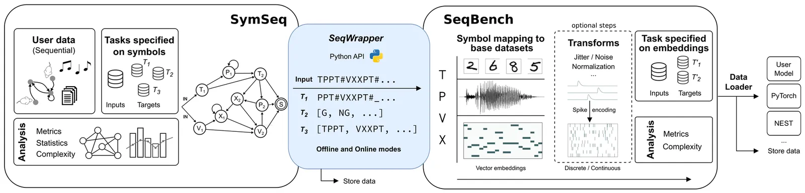 Sequential structure is a key feature of multiple domains of natural cognition and behavior, such as language, movement and decision-making. Likewise, it is also a central property of tasks to which we would like to apply artificial intelligence. It is therefore of great importance to develop frameworks that allow us to evaluate sequence learning and processing in a domain agnostic fashion, whilst simultaneously providing a link to formal theories of computation and computability. To address this need, we introduce two complementary software tools: SymSeq, designed to rigorously generate and analyze structured symbolic sequences, and SeqBench, a comprehensive benchmark suite of rule-based sequence processing tasks to evaluate the performance of artificial learning systems in cognitively relevant domains. In combination, SymSeqBench offers versatility in investigating sequential structure across diverse knowledge domains, including experimental psycholinguistics, cognitive psychology, behavioral analysis, neuromorphic computing and artificial intelligence. Due to its basis in Formal Language Theory (FLT), SymSeqBench provides researchers in multiple domains with a convenient and practical way to apply the concepts of FLT to conceptualize and standardize their experiments, thus advancing our understanding of cognition and behavior through shared computational frameworks and formalisms. The tool is modular, openly available and accessible to the research community.