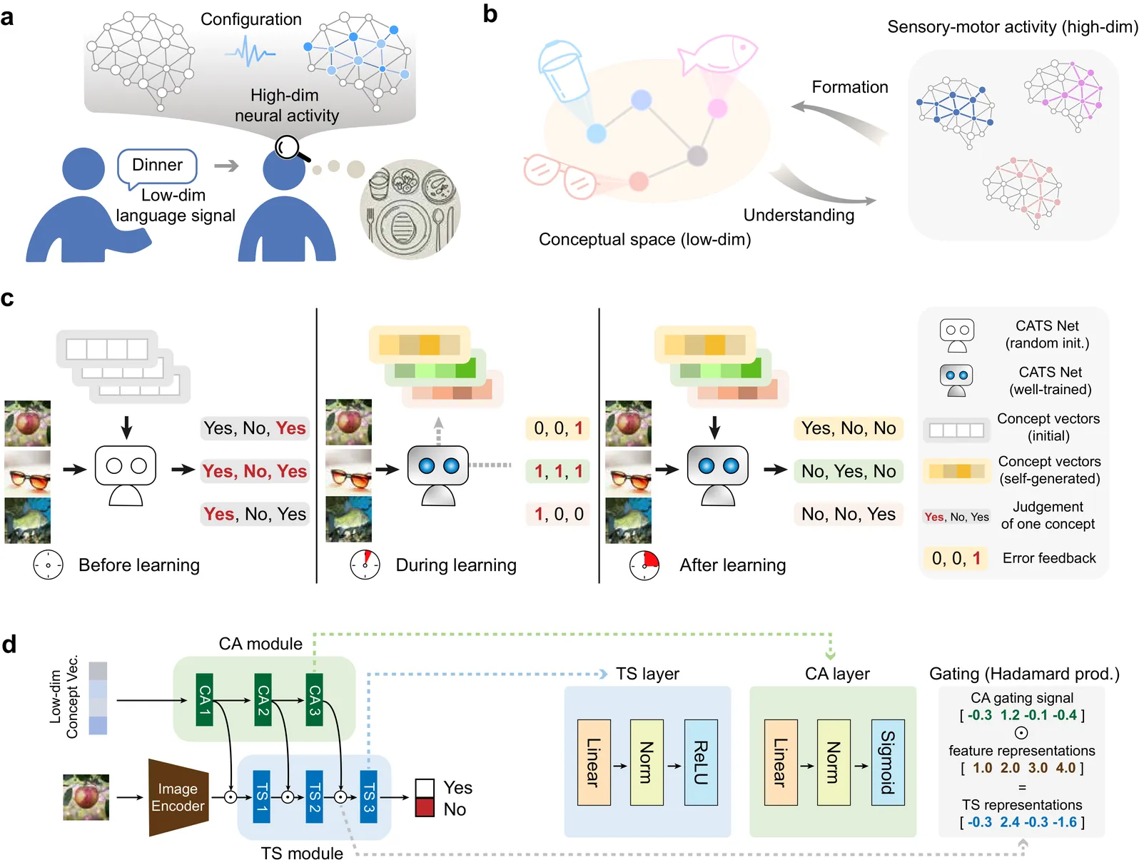A remarkable capability of the human brain is to form more abstract conceptual representations from sensorimotor experiences and flexibly apply them independent of direct sensory inputs. However, the computational mechanism underlying this ability remains poorly understood. Here, we present a dual-module neural network framework, the CATS Net, to bridge this gap. Our model consists of a concept-abstraction module that extracts low-dimensional conceptual representations, and a task-solving module that performs visual judgement tasks under the hierarchical gating control of the formed concepts. The system develops transferable semantic structure based on concept representations that enable cross-network knowledge transfer through conceptual communication. Model-brain fitting analyses reveal that these emergent concept spaces align with both neurocognitive semantic model and brain response structures in the human ventral occipitotemporal cortex, while the gating mechanisms mirror that in the semantic control brain network. This work establishes a unified computational framework that can offer mechanistic insights for understanding human conceptual cognition and engineering artificial systems with human-like conceptual intelligence.