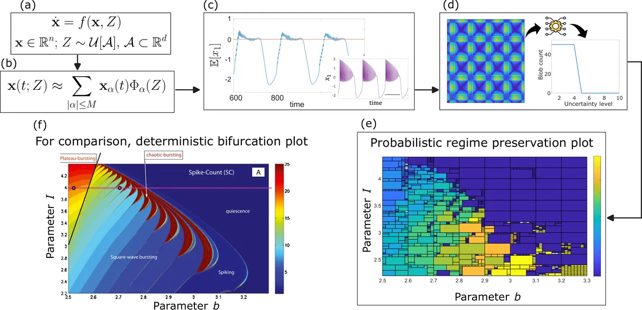Neuronal systems often preserve their characteristic functions and signalling patterns, also referred to as regimes, despite parametric uncertainties and variations. For neural models having uncertain parameters with a known probability distribution, probabilistic robustness analysis (PRA) allows us to understand and quantify under which uncertainty conditions a regime is preserved in expectation. We introduce a new computational framework for the efficient and systematic PRA of dynamical systems in neuroscience and we show its efficacy in analysing well-known neural models that exhibit multiple dynamical regimes: the Hindmarsh-Rose model for single neurons and the Jansen-Rit model for cortical columns. Given a model subject to parametric uncertainty, we employ generalised polynomial chaos to derive mean neural activity signals, which are then used to assess the amount of parametric uncertainty that the system can withstand while preserving the current regime, thereby quantifying the regime's robustness to such uncertainty. To assess persistence of regimes, we propose new metrics, which we apply to recurrence plots obtained from the mean neural activity signals. The overall result is a novel, general computational methodology that combines recurrence plot analysis and systematic persistence analysis to assess how much the uncertain model parameters can vary, with respect to their nominal value, while preserving the nominal regimes in expectation. We summarise the PRA results through probabilistic regime preservation (PRP) plots, which capture the effect of parametric uncertainties on the robustness of dynamical regimes in the considered models.