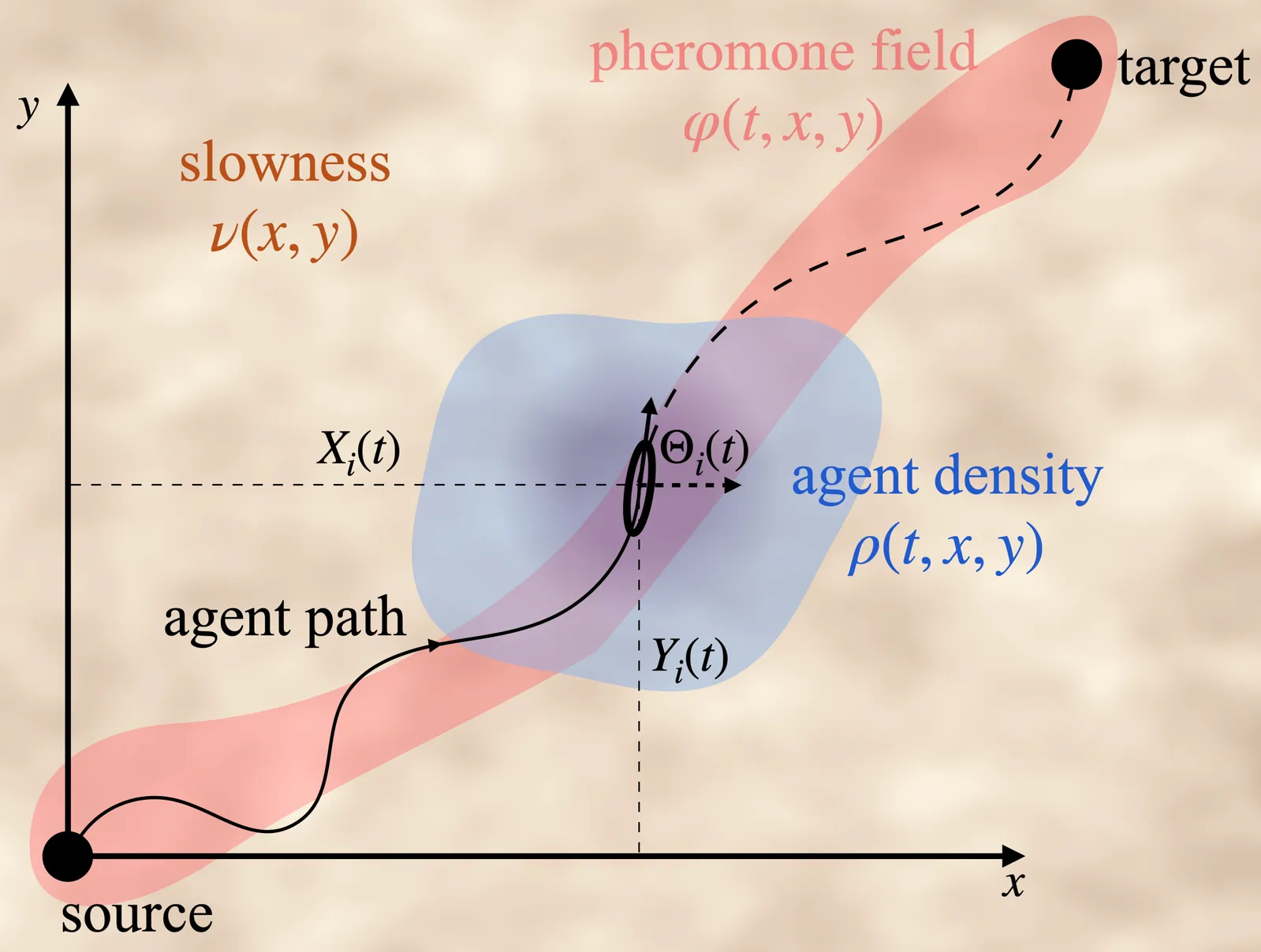Efficient navigation in swarms often relies on the emergence of decentralized approaches that minimize traversal time or energy. Stigmergy, where agents modify a shared environment that then modifies their behavior, is a classic mechanism that can encode this strategy. We develop a theoretical framework for stigmergic transport by casting it as a stochastic optimal control problem: agents (collectively) lay and (individually) follow trails while minimizing expected traversal time. Simulations and analysis reveal two emergent behaviors: path straightening in homogeneous environments and path refraction at material interfaces, both consistent with experimental observations of insect trails. While reminiscent of Fermat's principle, our results show how local, noisy agent+field interactions can give rise to geodesic trajectories in heterogeneous environments, without centralized coordination or global knowledge, relying instead on an embodied slow fast dynamical mechanism.