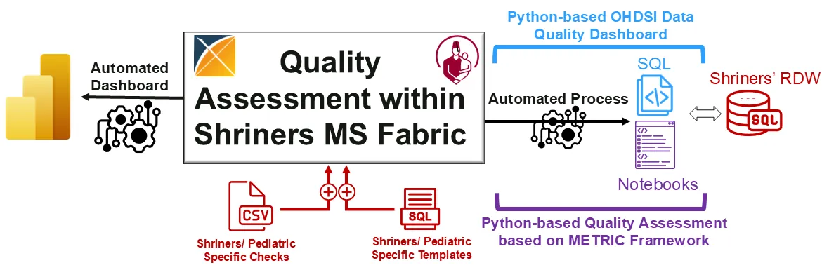The rapid growth of Artificial Intelligence (AI) in healthcare has sparked interest in Trustworthy AI and AI Implementation Science, both of which are essential for accelerating clinical adoption. However, strict regulations, gaps between research and clinical settings, and challenges in evaluating AI systems continue to hinder real-world implementation. This study presents an AI implementation case study within Shriners Childrens (SC), a large multisite pediatric system, showcasing the modernization of SCs Research Data Warehouse (RDW) to OMOP CDM v5.4 within a secure Microsoft Fabric environment. We introduce a Python-based data quality assessment tool compatible with SCs infrastructure, extending OHDsi's R/Java-based Data Quality Dashboard (DQD) and integrating Trustworthy AI principles using the METRIC framework. This extension enhances data quality evaluation by addressing informative missingness, redundancy, timeliness, and distributional consistency. We also compare systematic and case-specific AI implementation strategies for Craniofacial Microsomia (CFM) using the FHIR standard. Our contributions include a real-world evaluation of AI implementations, integration of Trustworthy AI principles into data quality assessment, and insights into hybrid implementation strategies that blend systematic infrastructure with use-case-driven approaches to advance AI in healthcare.