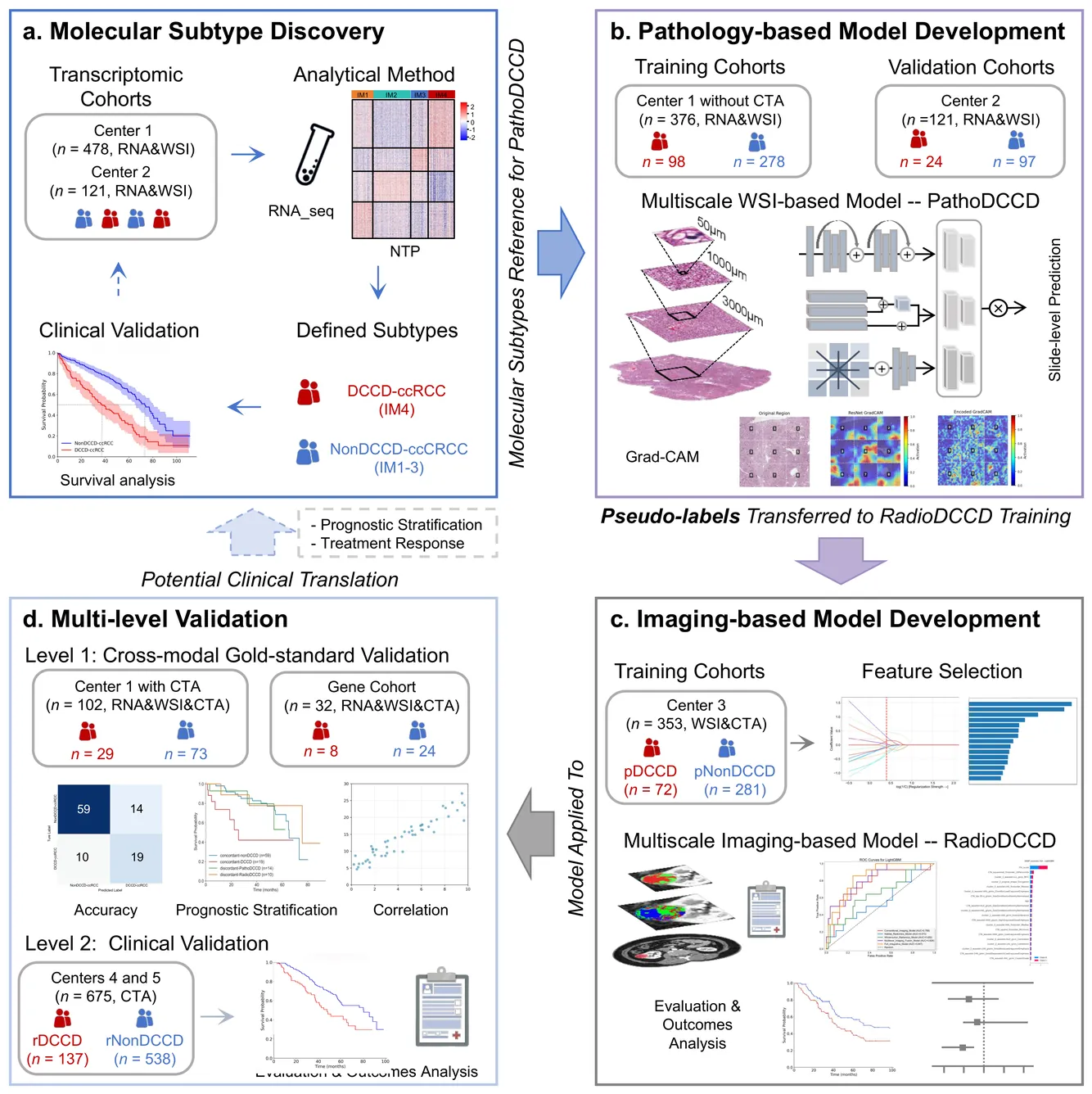 Clear cell renal cell carcinoma (ccRCC) exhibits extensive intratumoral heterogeneity on multiple biological scales, contributing to variable clinical outcomes and limiting the effectiveness of conventional TNM staging, which highlights the urgent need for multiscale integrative analytic frameworks. The lipid-deficient de-clear cell differentiated (DCCD) ccRCC subtype, defined by multi-omics analyses, is associated with adverse outcomes even in early-stage disease. Here, we establish a hierarchical cross-scale framework for the preoperative identification of DCCD-ccRCC. At the highest layer, cross-modal mapping transferred molecular signatures to histological and CT phenotypes, establishing a molecular-to-pathology-to-radiology supervisory bridge. Within this framework, each modality-specific model is designed to mirror the inherent hierarchical structure of tumor biology. PathoDCCD captured multi-scale microscopic features, from cellular morphology and tissue architecture to meso-regional organization. RadioDCCD integrated complementary macroscopic information by combining whole-tumor and its habitat-subregions radiomics with a 2D maximal-section heterogeneity metric. These nested models enabled integrated molecular subtype prediction and clinical risk stratification. Across five cohorts totaling 1,659 patients, PathoDCCD reliably recapitulated molecular subtypes, while RadioDCCD provided reliable preoperative prediction. The consistent predictions identified patients with the poorest clinical outcomes. This cross-scale paradigm unifies molecular biology, computational pathology, and quantitative radiology into a biologically grounded strategy for preoperative noninvasive molecular phenotyping of ccRCC.