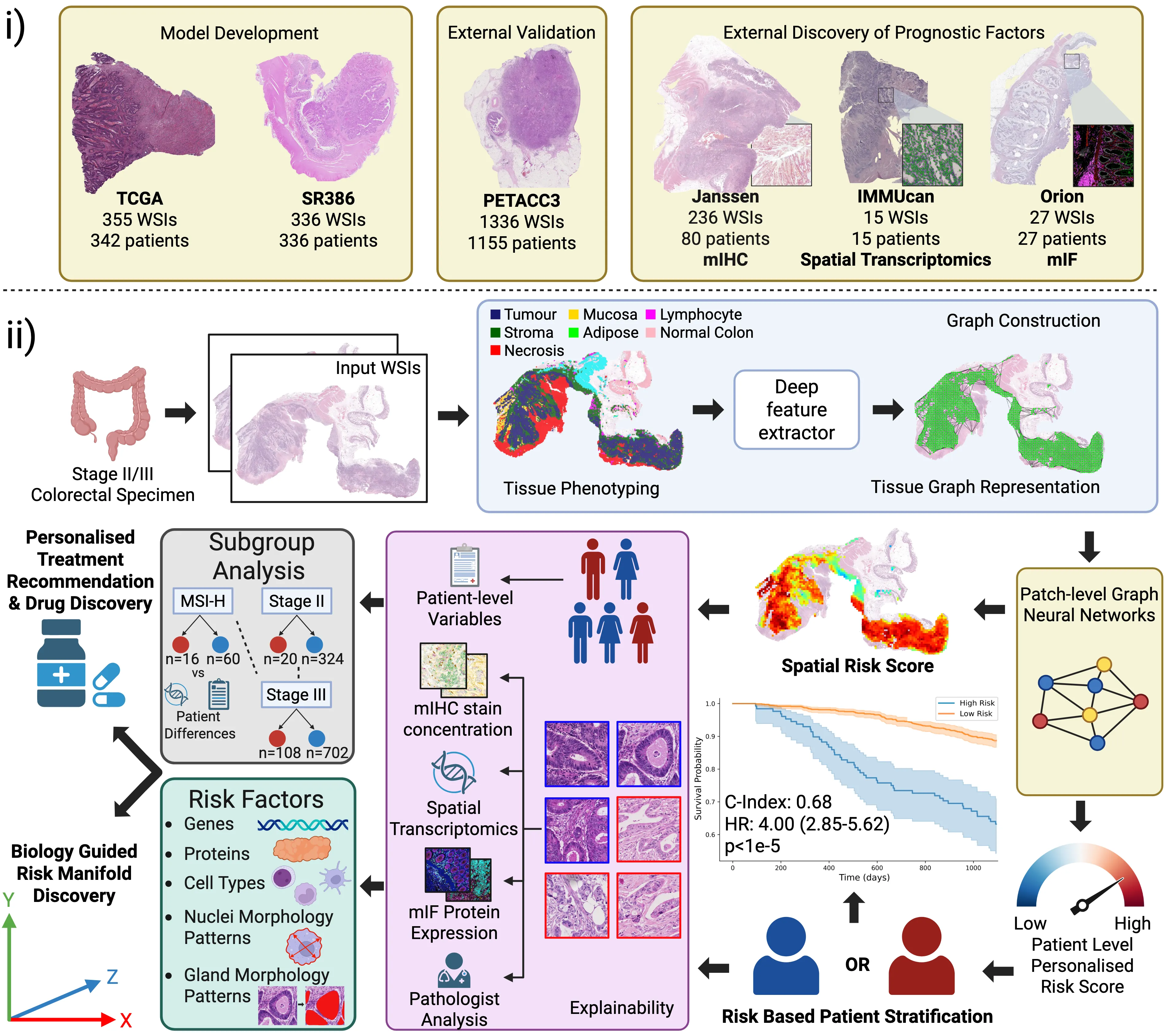 Routine histology contains rich prognostic information in stage II/III colorectal cancer, much of which is embedded in complex spatial tissue organisation. We present INSIGHT, a graph neural network that predicts survival directly from routine histology images. Trained and cross-validated on TCGA (n=342) and SURGEN (n=336), INSIGHT produces patient-level spatially resolved risk scores. Large independent validation showed superior prognostic performance compared with pTNM staging (C-index 0.68-0.69 vs 0.44-0.58). INSIGHT spatial risk maps recapitulated canonical prognostic histopathology and identified nuclear solidity and circularity as quantitative risk correlates. Integrating spatial risk with data-driven spatial transcriptomic signatures, spatial proteomics, bulk RNA-seq, and single-cell references revealed an epithelium-immune risk manifold capturing epithelial dedifferentiation and fetal programs, myeloid-driven stromal states including $\mathrm{SPP1}^{+}$ macrophages and $\mathrm{LAMP3}^{+}$ dendritic cells, and adaptive immune dysfunction. This analysis exposed patient-specific epithelial heterogeneity, stratification within MSI-High tumours, and high-risk routes of CDX2/HNF4A loss and CEACAM5/6-associated proliferative programs, highlighting coordinated therapeutic vulnerabilities.
