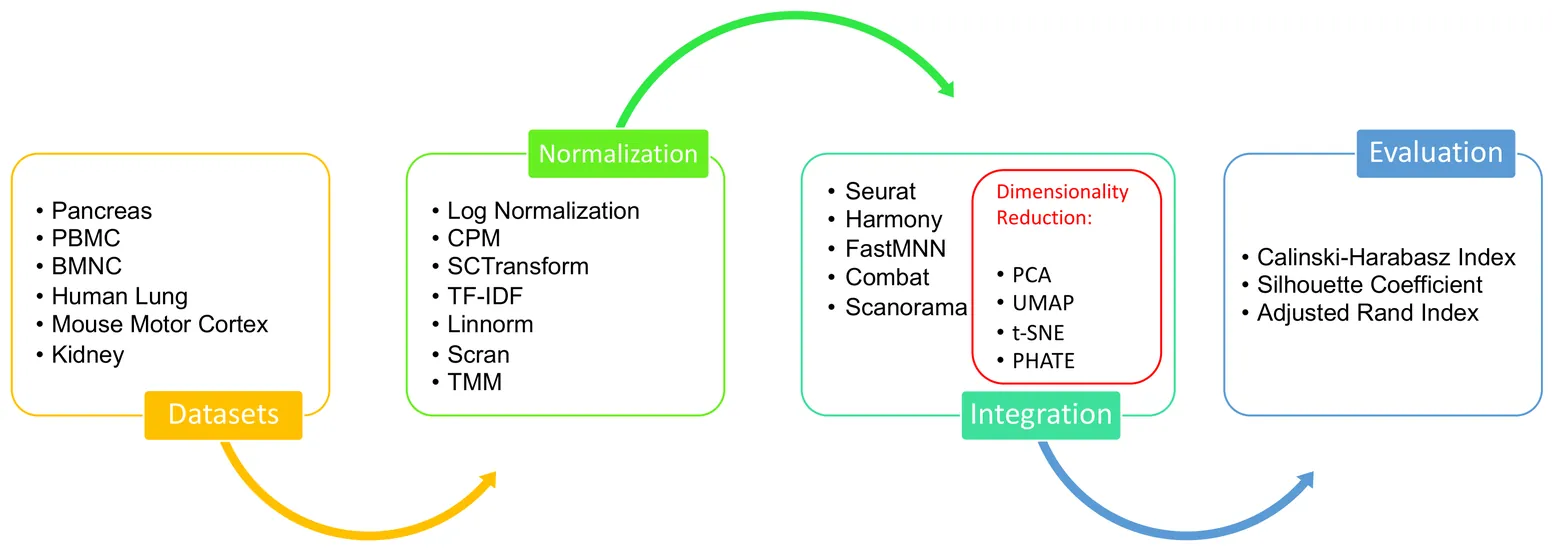 Single-cell data analysis has the potential to revolutionize personalized medicine by characterizing disease-associated molecular changes at the single-cell level. Advanced single-cell multimodal assays can now simultaneously measure various molecules (e.g., DNA, RNA, Protein) across hundreds of thousands of individual cells, providing a comprehensive molecular readout. A significant analytical challenge is integrating single-cell measurements across different modalities. Various methods have been developed to address this challenge, but there has been no systematic evaluation of these techniques with different preprocessing strategies. This study examines a general pipeline for single-cell data analysis, which includes normalization, data integration, and dimensionality reduction. The performance of different algorithm combinations often depends on the dataset sizes and characteristics. We evaluate six datasets across diverse modalities, tissues, and organisms using three metrics: Silhouette Coefficient Score, Adjusted Rand Index, and Calinski-Harabasz Index. Our experiments involve combinations of seven normalization methods, four dimensional reduction methods, and five integration methods. The results show that Seurat and Harmony excel in data integration, with Harmony being more time-efficient, especially for large datasets. UMAP is the most compatible dimensionality reduction method with the integration techniques, and the choice of normalization method varies depending on the integration method used.