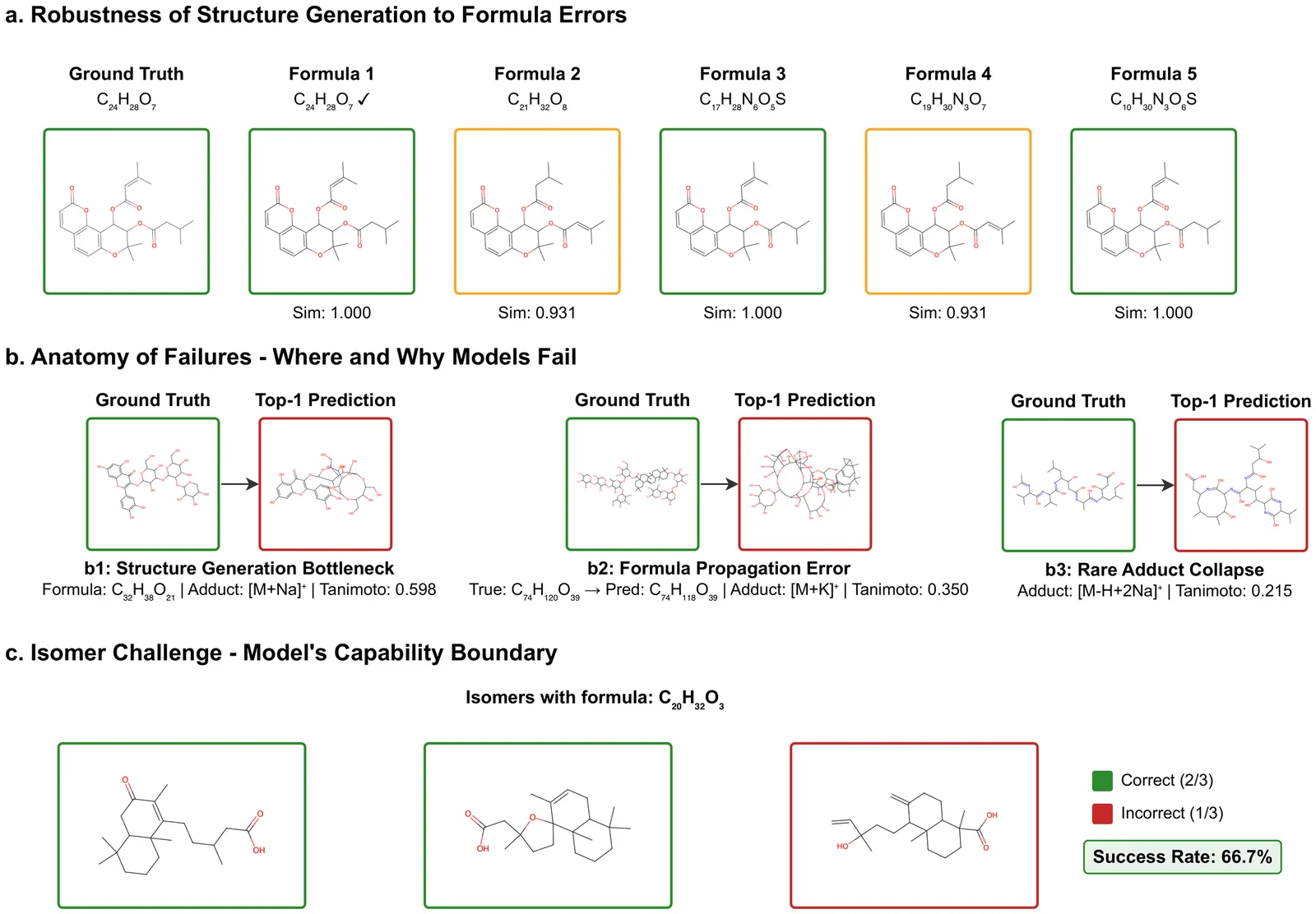 Liquid chromatography mass spectrometry (LC-MS)-based metabolomics and exposomics aim to measure detectable small molecules in biological samples. The results facilitate hypothesis-generating discovery of metabolic changes and disease mechanisms and provide information about environmental exposures and their effects on human health. Metabolomics and exposomics are made possible by the high resolving power of LC and high mass measurement accuracy of MS. However, a majority of the signals from such studies still cannot be identified or annotated using conventional library searching because existing spectral libraries are far from covering the vast chemical space captured by LC-MS/MS. To address this challenge and unleash the full potential of metabolomics and exposomics, a number of computational approaches have been developed to predict compounds based on tandem mass spectra. Published assessment of these approaches used different datasets and evaluation. To select prediction workflows for practical applications and identify areas for further improvements, we have carried out a systematic evaluation of the state-of-the-art prediction algorithms. Specifically, the accuracy of formula prediction and structure prediction was evaluated for different types of adducts. The resulting findings have established realistic performance baselines, identified critical bottlenecks, and provided guidance to further improve compound predictions based on MS.