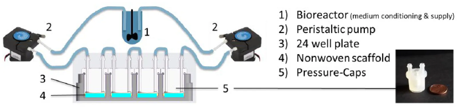 We develop a model the dynamics of human mesenchymal stem cells (hMSCs) and chondrocytes evolving in a nonwoven polyethylene terephtalate (PET) scaffold impregnated with hyaluron and supplied with a differentiation medium. The scaffold and the cells are assumed to be contained in a bioreactor with fluid perfusion. The differentiation of hMSCs into chondrocytes favors the production of extracellular matrix (ECM) and is influenced by fluid stress. The model takes deformations of ECM and PET scaffold into account. The scaffold structure is explicitly included by statistical assessment of the fibre distribution from CT images. The effective macroscopic equations are obtained by appropriate upscaling from dynamics on lower (microscopic and mesoscopic) scales and feature in the motility terms an explicit cell diffusion tensor encoding the assessed anisotropic scaffold structure. Numerical simulations show its influence on the overall cell and tissue dynamics.