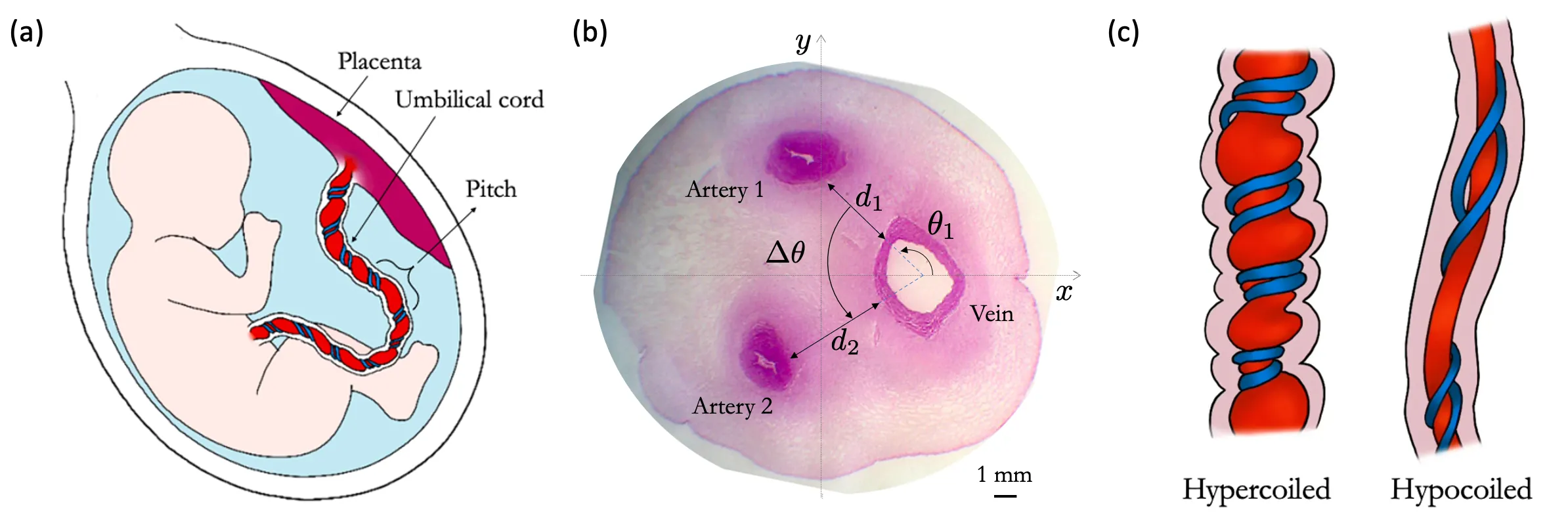 The umbilical cord plays a critical role in delivering nutrients and oxygen from the placenta to the fetus through the umbilical vein, while the two umbilical arteries carry deoxygenated blood with waste products back to the placenta. Although solute exchange in the placenta has been extensively studied, exchange within the cord tissue has not been investigated. Here, we explore the hypothesis that the coiled structure of the umbilical cord could strengthen diffusive coupling between the arteries and the vein, resulting in a functional shunt. We calculate the diffusion of solutes, such as oxygen, and heat in the umbilical cord to quantify how this shunt is affected by vascular configuration within the cord. We demonstrate that the shunt is enhanced by coiling and vessel proximity. Furthermore, our model predicts that typical vascular configurations of the human cord tend to minimise shunting, which could otherwise disrupt thermal regulation of the fetus. We also show that the exchange, amplified by coiling, can provide additional oxygen supply to the cord tissue surrounding the umbilical vessels.