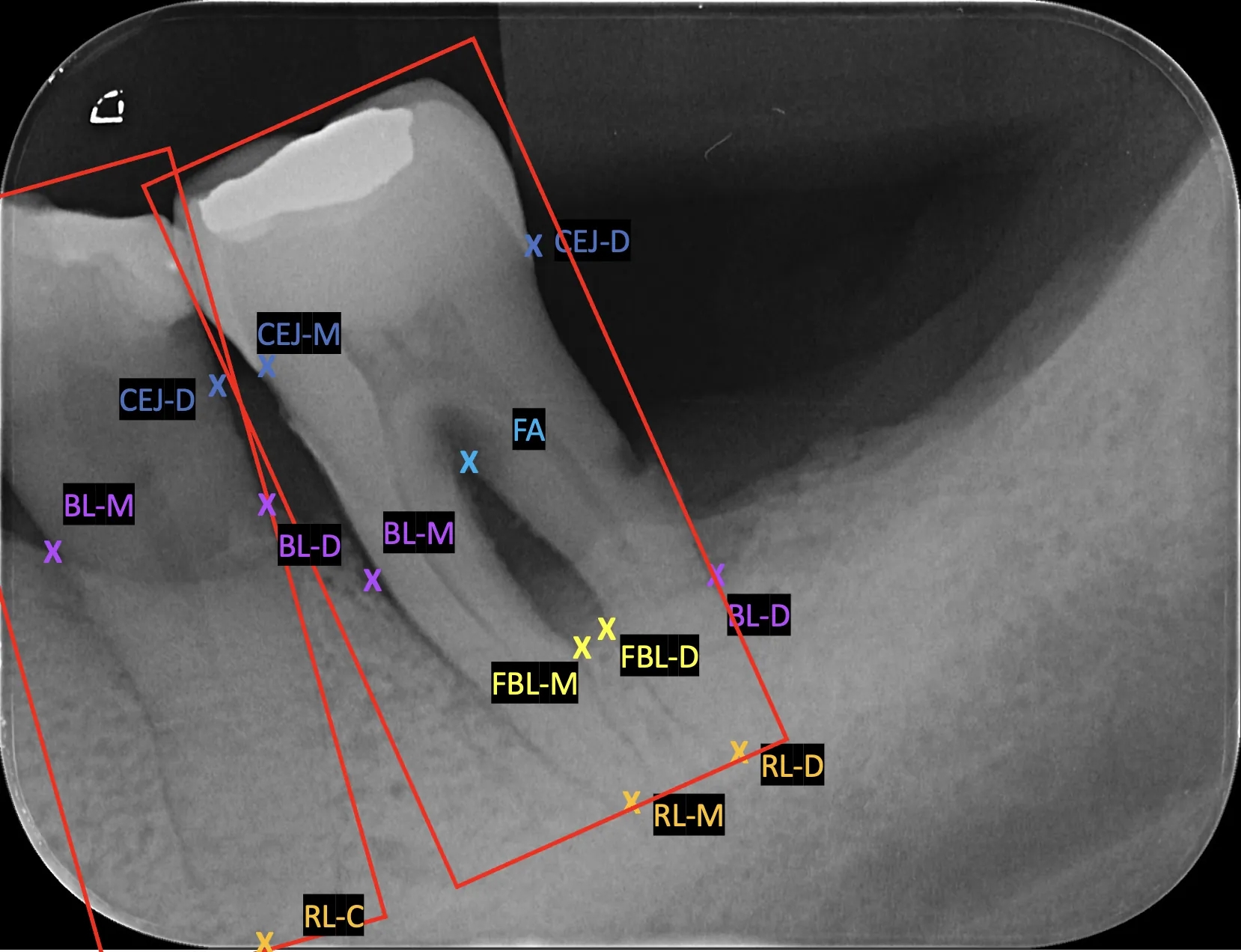 This study proposes a deep learning framework and annotation methodology for the automatic detection of periodontal bone loss landmarks, associated conditions, and staging. 192 periapical radiographs were collected and annotated with a stage agnostic methodology, labelling clinically relevant landmarks regardless of disease presence or extent. We propose a heuristic post-processing module that aligns predicted keypoints to tooth boundaries using an auxiliary instance segmentation model. An evaluation metric, Percentage of Relative Correct Keypoints (PRCK), is proposed to capture keypoint performance in dental imaging domains. Four donor pose estimation models were adapted with fine-tuning for our keypoint problem. Post-processing improved fine-grained localisation, raising average PRCK^{0.05} by +0.028, but reduced coarse performance for PRCK^{0.25} by -0.0523 and PRCK^{0.5} by -0.0345. Orientation estimation shows excellent performance for auxiliary segmentation when filtered with either stage 1 object detection model. Periodontal staging was detected sufficiently, with the best mesial and distal Dice scores of 0.508 and 0.489, while furcation involvement and widened periodontal ligament space tasks remained challenging due to scarce positive samples. Scalability is implied with similar validation and external set performance. The annotation methodology enables stage agnostic training with balanced representation across disease severities for some detection tasks. The PRCK metric provides a domain-specific alternative to generic pose metrics, while the heuristic post-processing module consistently corrected implausible predictions with occasional catastrophic failures. The proposed framework demonstrates the feasibility of clinically interpretable periodontal bone loss assessment, with potential to reduce diagnostic variability and clinician workload.
