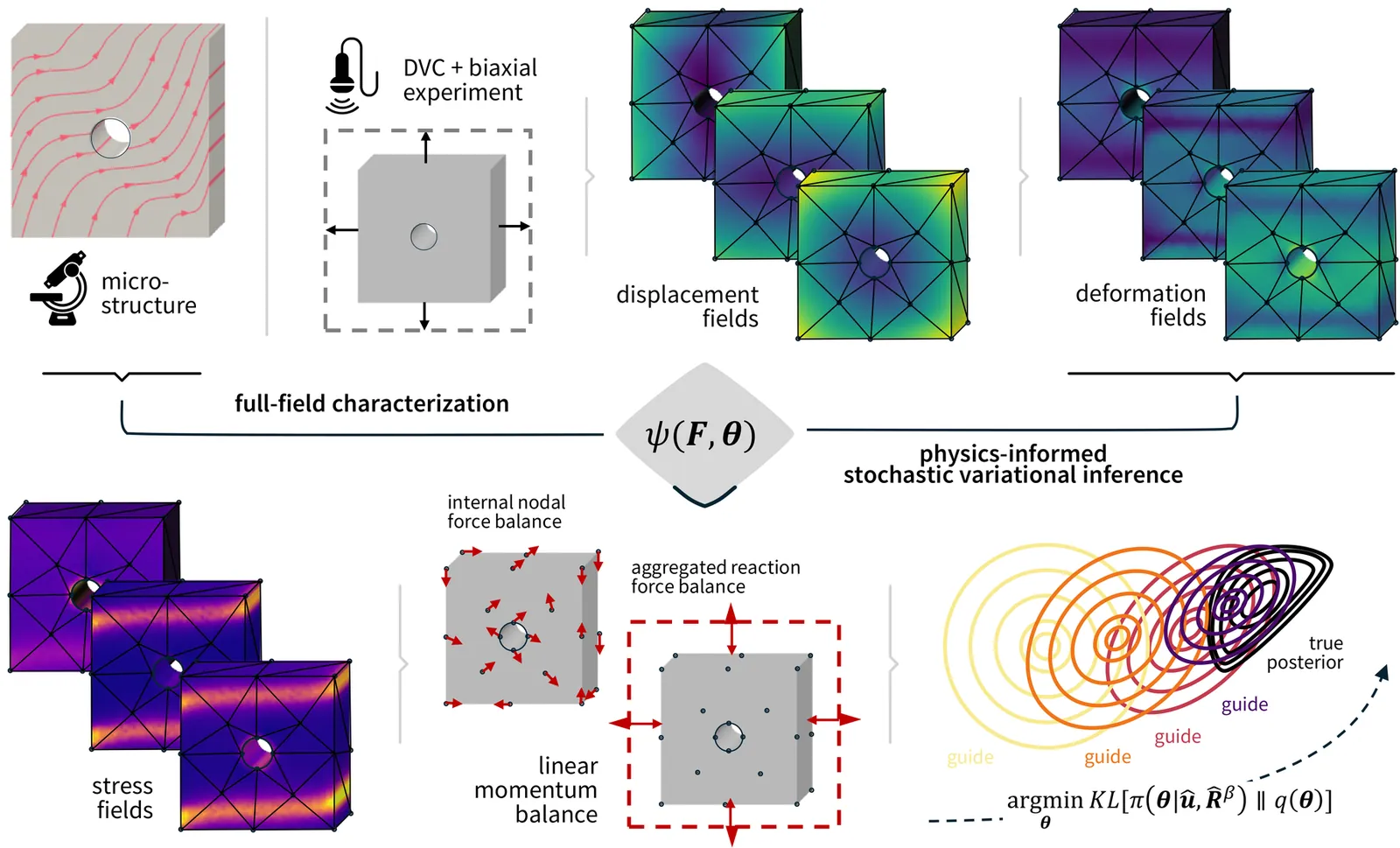Fully capturing this behavior in traditional homogenized tissue testing requires the excitation of multiple deformation modes, i.e. combined triaxial shear tests and biaxial stretch tests. Inherently, such multimodal experimental protocols necessitate multiple tissue samples and extensive sample manipulations. Intrinsic inter-sample variability and manipulation-induced tissue damage might have an adverse effect on the inversely identified tissue behavior. In this work, we aim to overcome this gap by focusing our attention to the use of heterogeneous deformation profiles in a parameter estimation problem. More specifically, we adapt EUCLID, an unsupervised method for the automated discovery of constitutive models, towards the purpose of parameter identification for highly nonlinear, orthotropic constitutive models using a Bayesian inference approach and three-dimensional continuum elements. We showcase its strength to quantitatively infer, with varying noise levels, the material model parameters of synthetic myocardial tissue slabs from a single heterogeneous biaxial stretch test. This method shows good agreement with the ground-truth simulations and with corresponding credibility intervals. Our work highlights the potential for characterizing highly nonlinear and orthotropic material models from a single biaxial stretch test with uncertainty quantification.