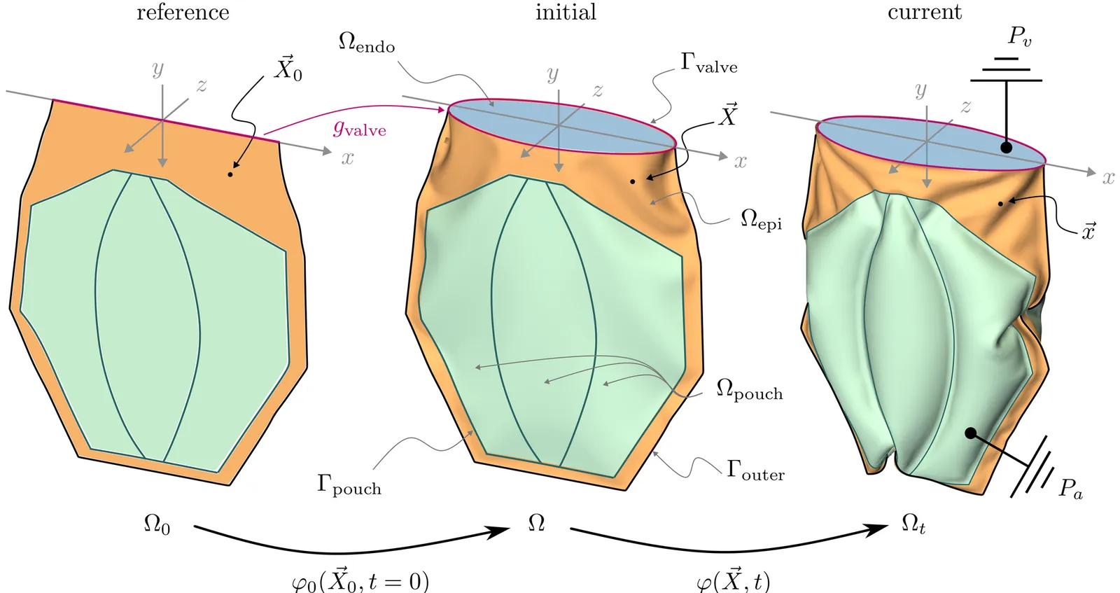 Fabric-based soft robots combine high load-carrying capacity, efficiency, and low weight with the ability to bend, twist, contract, or extend with ease, making them promising candidates for biomedical applications such as soft total artificial hearts. While recent experiments have demonstrated their potential, predictive numerical models are urgently needed to study their complex mechanics, guide design optimization and improve their reliability. We develop a computational model of the Less In More Out device, a fluidically actuated soft total artificial heart constructed from heat-sealed layers of woven fabric. Our model reproduces the nonlinear deformation, strain fields, and pressure-volume relationships measured in quasi-static experiments. Devices with fewer pouches deliver higher stroke volumes but exhibit up to 50% higher peak von Mises stresses. Fatigue analysis using a strain-life approach identifies heat-sealed seams and buckling regions as durability-limiting features. Our framework enables detailed evaluation of stress concentrations, buckling, and fatigue life, providing mechanistic insights that are difficult to obtain experimentally. It also offers a foundation for the optimization of artificial hearts and other fluid actuated fabric-based soft robotic systems.