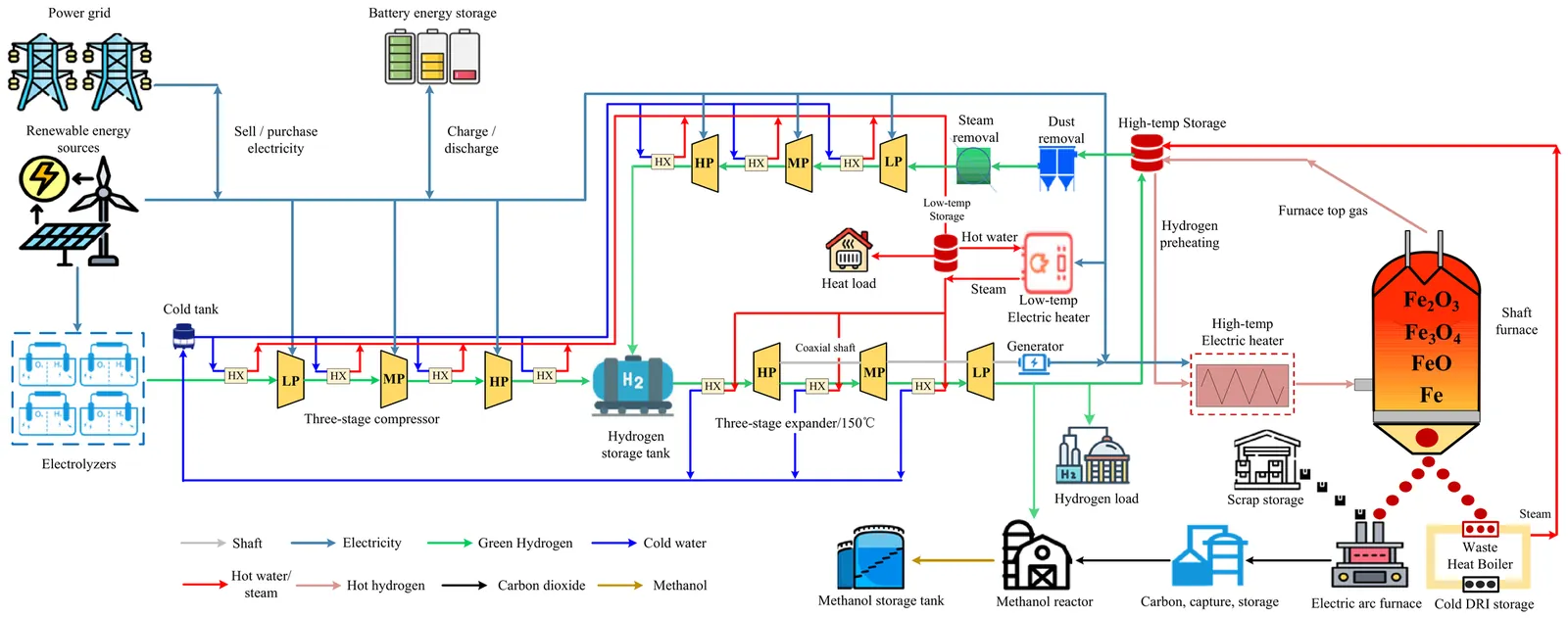 The integration of the high penetration of intermittent renewable energy sources (RES) and the retirement of thermal units have significantly aggravated the flexibility scarcity and real-time balancing challenges in power systems. Low-carbon steel production systems, based on green-hydrogen ironmaking and electrified melting, possess substantial demand response (DR) potential. This paper proposes a process-aware DR evaluation framework for hydrogen-integrated zero-carbon steel plants coupled with methanol production (H2-DRI-EAF-MeOH). First, a novel zero-carbon steel production system architecture is established to explicitly represent the energy-material flow coupling relationships among electricity, hydrogen, heat, iron, steel, CO2, and methanol. Second, to explicitly capture electric arc furnace (EAF) operational constraints while preserving optimization tractability, an operating feasible region model is developed and validated using field data from a pure hydrogen direct reduced iron and EAF plant, yielding an average relative error of 4.1%. Finally, a process-aware DR scheduling model is formulated by incorporating the proposed process deviation penalties to balance economic performance against process disturbance costs and operational acceptability. Additionally, dual-side evaluation metrics are developed to quantify grid-side regulation performance and load-side flexibility characteristics. Case studies demonstrate that under real-time pricing, the proposed system achieves an average DR capacity of 275.4 MW, improves the RES-load matching degree from 0.262 to 0.508, and reduces total operational costs by 17.78% compared with the baseline scheduling scheme. The proposed framework provides a theoretical foundation for RES-steel-chemical synergies.