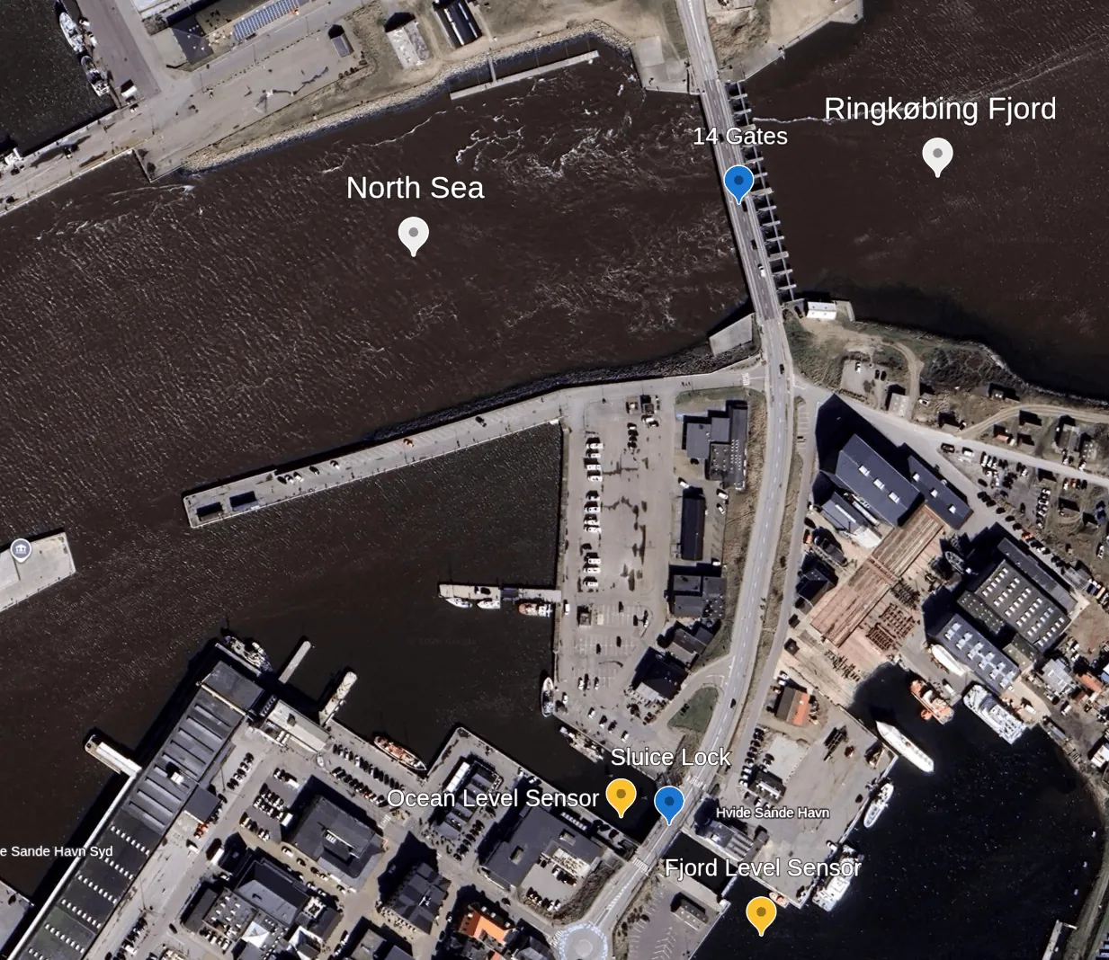 Ringkoebing Fjord is an inland water basin on the Danish west coast separated from the North Sea by a set of gates used to control the amount of water entering and leaving the fjord. Currently, human operators decide when and how many gates to open or close for controlling the fjord's water level, with the goal to satisfy a range of conflicting safety and performance requirements such as keeping the water level in a target range, allowing maritime traffic, and enabling fish migration. Uppaal Stratego. We then use this digital twin along with forecasts of the sea level and the wind speed to learn a gate controller in an online fashion. We evaluate the learned controllers under different sea-level scenarios, representing normal tidal behavior, high waters, and low waters. Our evaluation demonstrates that, unlike a baseline controller, the learned controllers satisfy the safety requirements, while performing similarly regarding the other requirements.