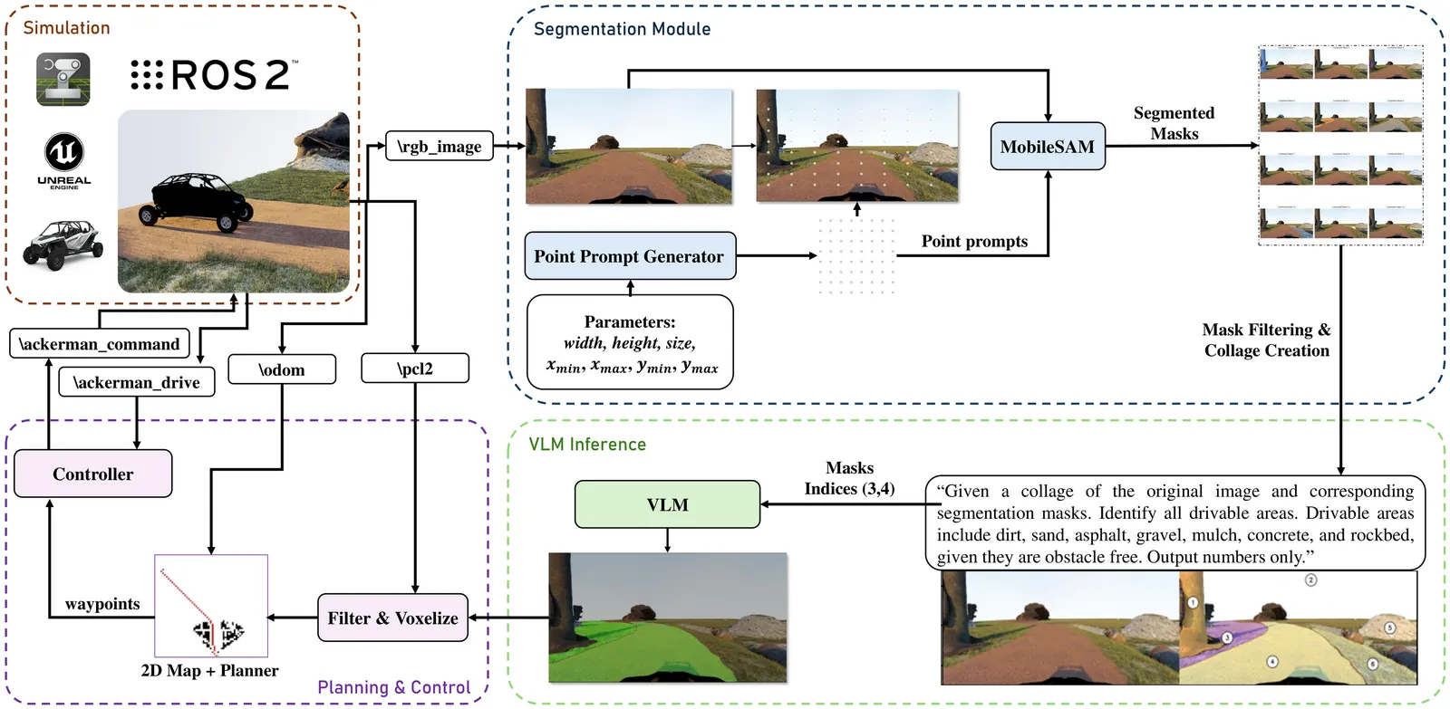 Traditional approaches to off-road autonomy rely on separate models for terrain classification, height estimation, and quantifying slip or slope conditions. Utilizing several models requires training each component separately, having task specific datasets, and fine-tuning. In this work, we present a zero-shot approach leveraging SAM2 for environment segmentation and a vision-language model (VLM) to reason about drivable areas. Our approach involves passing to the VLM both the original image and the segmented image annotated with numeric labels for each mask. The VLM is then prompted to identify which regions, represented by these numeric labels, are drivable. Combined with planning and control modules, this unified framework eliminates the need for explicit terrain-specific models and relies instead on the inherent reasoning capabilities of the VLM. Our approach surpasses state-of-the-art trainable models on high resolution segmentation datasets and enables full stack navigation in our Isaac Sim offroad environment.