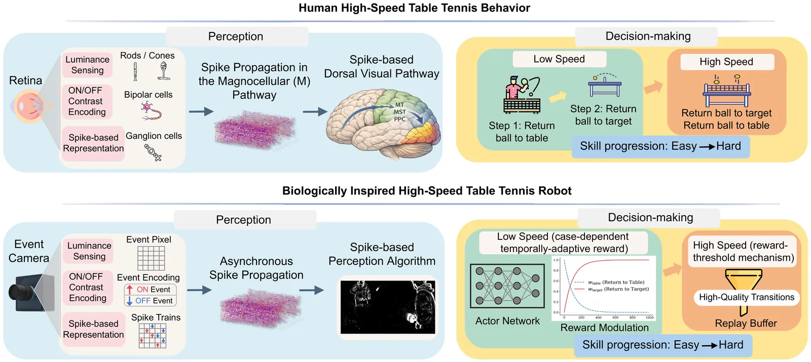 Perception and decision-making in high-speed dynamic scenarios remain challenging for current robots. In contrast, humans and animals can rapidly perceive and make decisions in such environments. Taking table tennis as a typical example, conventional frame-based vision sensors suffer from motion blur, high latency and data redundancy, which can hardly meet real-time, accurate perception requirements. Inspired by the human visual system, event-based perception methods address these limitations through asynchronous sensing, high temporal resolution, and inherently sparse data representations. However, current event-based methods are still restricted to simplified, unrealistic ball-only scenarios. Meanwhile, existing decision-making approaches typically require thousands of interactions with the environment to converge, resulting in significant computational costs. In this work, we present a biologically inspired approach for high-speed table tennis robots, combining event-based perception with sample-efficient learning. On the perception side, we propose an event-based ball detection method that leverages motion cues and geometric consistency, operating directly on asynchronous event streams without frame reconstruction, to achieve robust and efficient detection in real-world rallies. On the decision-making side, we introduce a human-inspired, sample-efficient training strategy that first trains policies in low-speed scenarios, progressively acquiring skills from basic to advanced, and then adapts them to high-speed scenarios, guided by a case-dependent temporally adaptive reward and a reward-threshold mechanism. With the same training episodes, our method improves return-to-target accuracy by 35.8%. These results demonstrate the effectiveness of biologically inspired perception and decision-making for high-speed robotic systems.