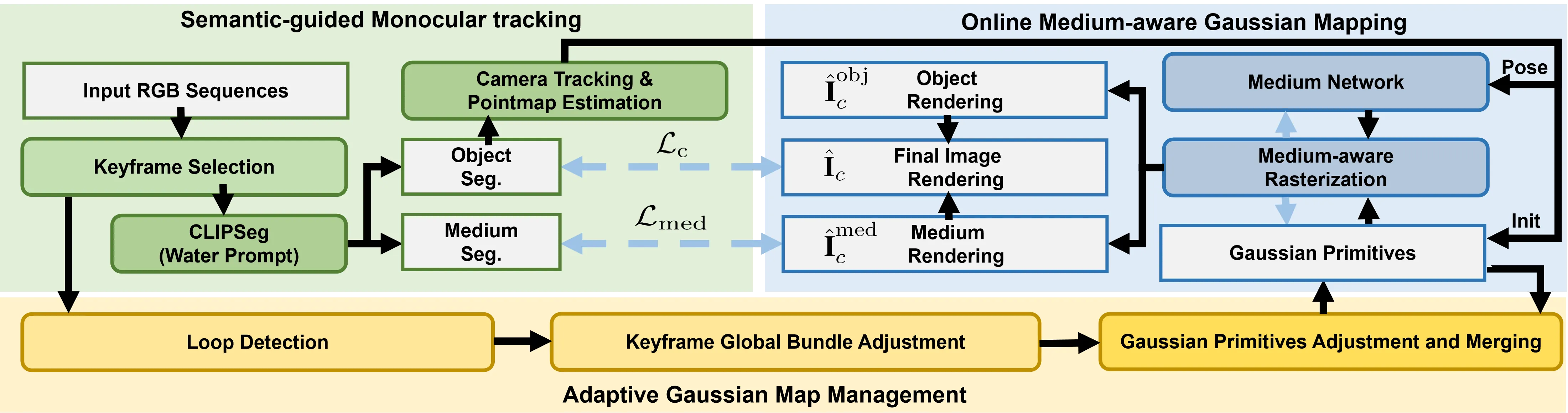 Underwater monocular SLAM is a challenging problem with applications from autonomous underwater vehicles to marine archaeology. However, existing underwater SLAM methods struggle to produce maps with high-fidelity rendering. In this paper, we propose WaterSplat-SLAM, a novel monocular underwater SLAM system that achieves robust pose estimation and photorealistic dense mapping. Specifically, we couple semantic medium filtering into two-view 3D reconstruction prior to enable underwater-adapted camera tracking and depth estimation. Furthermore, we present a semantic-guided rendering and adaptive map management strategy with an online medium-aware Gaussian map, modeling underwater environment in a photorealistic and compact manner. Experiments on multiple underwater datasets demonstrate that WaterSplat-SLAM achieves robust camera tracking and high-fidelity rendering in underwater environments.