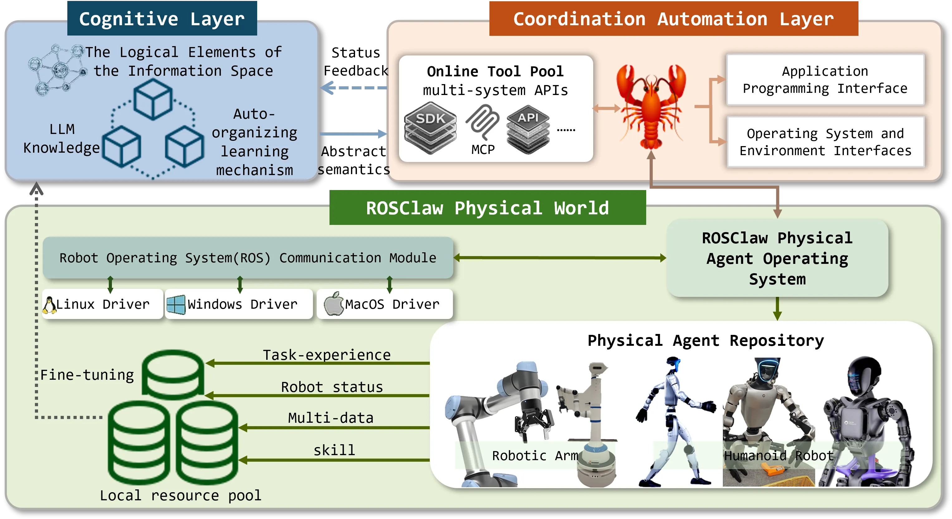 The integration of large language models (LLMs) with embodied agents has improved high-level reasoning capabilities; however, a critical gap remains between semantic understanding and physical execution. While vision-language-action (VLA) and vision-language-navigation (VLN) systems enable robots to perform manipulation and navigation tasks from natural language instructions, they still struggle with long-horizon sequential and temporally structured tasks. Existing frameworks typically adopt modular pipelines for data collection, skill training, and policy deployment, resulting in high costs in experimental validation and policy optimization. To address these limitations, we propose ROSClaw, an agent framework for heterogeneous robots that integrates policy learning and task execution within a unified vision-language model (VLM) controller. The framework leverages e-URDF representations of heterogeneous robots as physical constraints to construct a sim-to-real topological mapping, enabling real-time access to the physical states of both simulated and real-world agents. We further incorporate a data collection and state accumulation mechanism that stores robot states, multimodal observations, and execution trajectories during real-world execution, enabling subsequent iterative policy optimization. During deployment, a unified agent maintains semantic continuity between reasoning and execution, and dynamically assigns task-specific control to different agents, thereby improving robustness in multi-policy execution. By establishing an autonomous closed-loop framework, ROSClaw minimizes the reliance on robot-specific development workflows. The framework supports hardware-level validation, automated generation of SDK-level control programs, and tool-based execution, enabling rapid cross-platform transfer and continual improvement of robotic skills. Ours project page: https://www.rosclaw.io/.