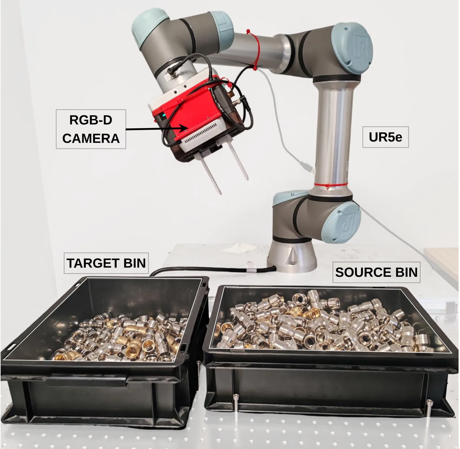 Bin picking in real industrial environments remains challenging due to severe clutter, occlusions, and the high cost of traditional 3D sensing setups. We present Pickalo, a modular 6D pose-based bin-picking pipeline built entirely on low-cost hardware. A wrist-mounted RGB-D camera actively explores the scene from multiple viewpoints, while raw stereo streams are processed with BridgeDepth to obtain refined depth maps suitable for accurate collision reasoning. Object instances are segmented with a Mask-RCNN model trained purely on photorealistic synthetic data and localized using the zero-shot SAM-6D pose estimator. A pose buffer module fuses multi-view observations over time, handling object symmetries and significantly reducing pose noise. Offline, we generate and curate large sets of antipodal grasp candidates per object; online, a utility-based ranking and fast collision checking are queried for the grasp planning. Deployed on a UR5e with a parallel-jaw gripper and an Intel RealSense D435i, Pickalo achieves up to 600 mean picks per hour with 96-99% grasp success and robust performance over 30-minute runs on densely filled euroboxes. Ablation studies demonstrate the benefits of enhanced depth estimation and of the pose buffer for long-term stability and throughput in realistic industrial conditions. Videos are available at https://mesh-iit.github.io/project-jl2-camozzi/