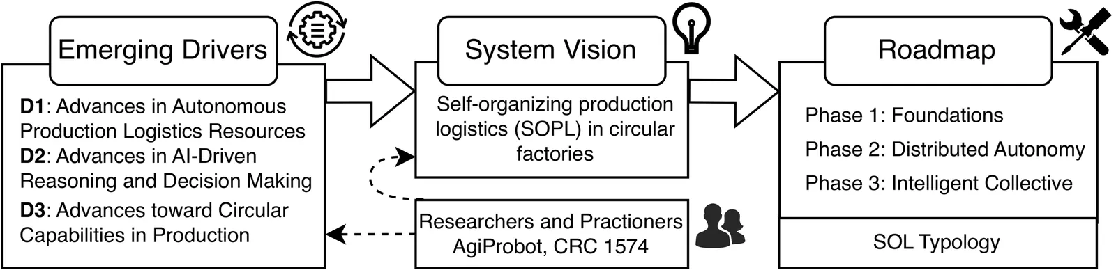 Production logistics in circular factories is characterized by structural uncertainty due to variability in product-core quality, availability, and timing. These conditions challenge conventional deterministic and centrally planned control approaches. This paper proposes a vision for a multi-agent system based on decentralized decision-making through negotiations and event-driven communication serving as an enabler for self-organizing production logistics (SOPL) in circular factories. The envisioned system architecture integrates embodied agents, a shared semantic knowledge layer, and dynamically instantiated digital twins to support monitoring, prediction, and scenario evaluation. By shifting decision-making closer to execution and enabling agents to interpret tasks, assess capabilities, and negotiate responsibilities, the approach is expected to increase responsiveness and improve resilience to disruptions inherent in circular factories. Building on this vision, a three-phase development roadmap is introduced and characterized using the self-organizing logistics (SOL) typology, providing a structured pathway toward the realization of SOPL in circular factories.