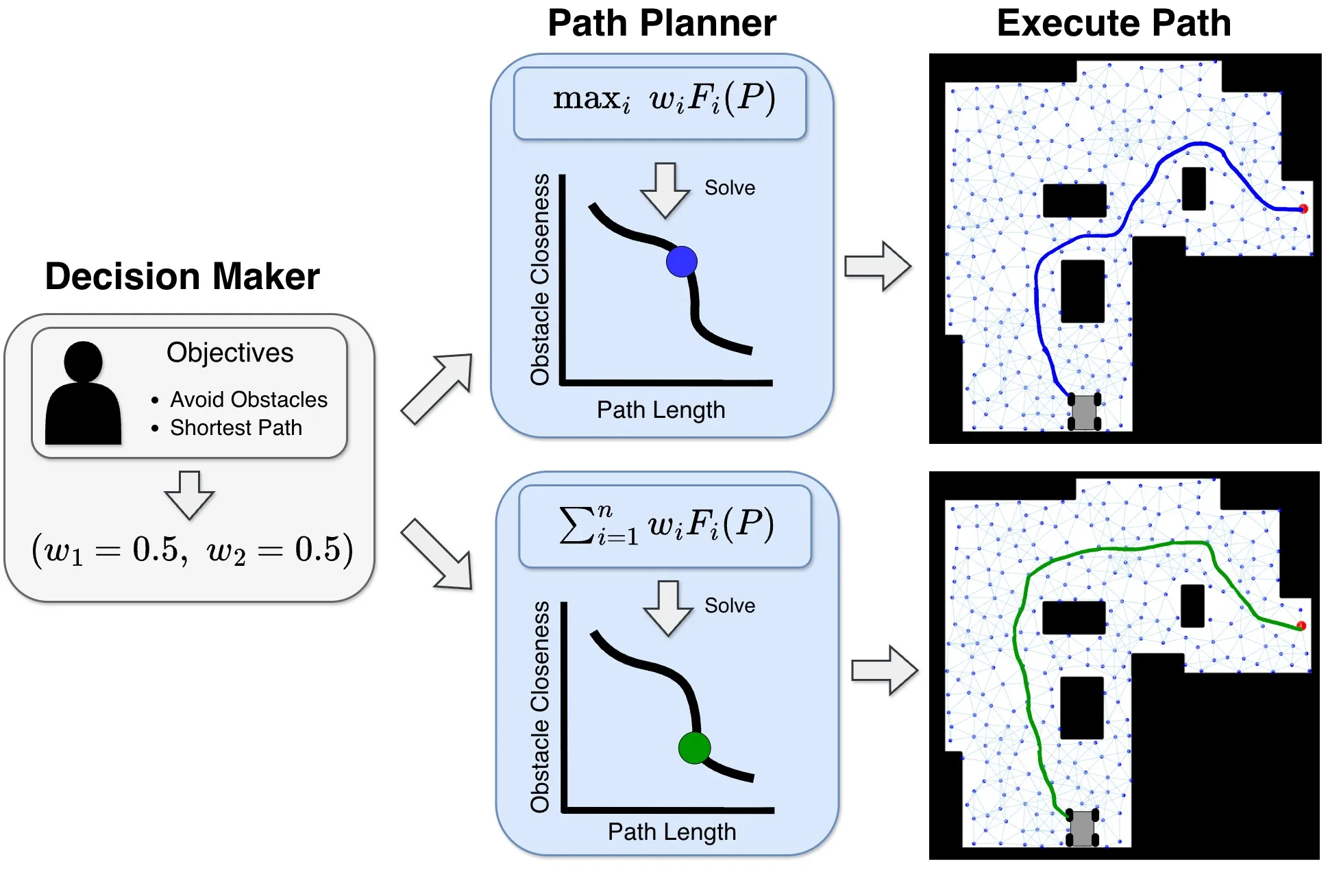 Autonomous navigation often requires the simultaneous optimization of multiple objectives. The most common approach scalarizes these into a single cost function using a weighted sum, but this method is unable to find all possible trade-offs and can therefore miss critical solutions. An alternative, the weighted maximum of objectives, can find all Pareto-optimal solutions, including those in non-convex regions of the trade-off space that weighted sum methods cannot find. However, the increased computational complexity of finding weighted maximum solutions in the discrete domain has limited its practical use. To address this challenge, we propose a novel search algorithm based on the Large Neighbourhood Search framework that efficiently solves the weighted maximum planning problem. Through extensive simulations, we demonstrate that our algorithm achieves comparable solution quality to existing weighted maximum planners with a runtime improvement of 1-2 orders of magnitude, making it a viable option for autonomous navigation.