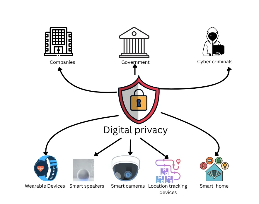 Privacy has always been a critical issue in the digital era, particularly with the increasing use of Internet of Things (IoT) devices. As the IoT continues to transform industries such as healthcare, smart cities, and home automation, it has also introduced serious challenges regarding the security of sensitive and private data. This paper examines the complex landscape of digital privacy in IoT ecosystems, highlighting the need to protect personally identifiable information (PII) of individuals and uphold their rights to digital independence. Global events, such as the COVID-19 pandemic, have accelerated the adoption of IoT, raising concerns about privacy and data protection. This paper provides an in-depth examination of digital privacy risks in the IoT domain and introduces a clear taxonomy for evaluating them using the IEEE Digital Privacy Model. The proposed framework categorizes privacy risks into five types: identity-oriented, behavioral, inference, data manipulation, and regulatory risks. We review existing digital privacy solutions, including encryption technologies, blockchain, federated learning, differential privacy, reinforcement learning, AI, and dynamic consent mechanisms, to mitigate these risks. We also highlight how these privacy-enhancing technologies (PETs) help with data confidentiality, access control, and trust management. Additionally, this study presents AURA-IoT, a futuristic framework that tackles AI-driven privacy risks through a multi-layered structure. AURA-IoT integrates adversarial robustness, explainability, transparency, fairness, compliance, dynamic consent, and policy enforcement mechanisms to ensure digital privacy, security, and accountable IoT operations. Finally, we discuss ongoing challenges and potential research directions for integrating AI and encryption-based privacy solutions to achieve comprehensive digital privacy in future IoT systems.