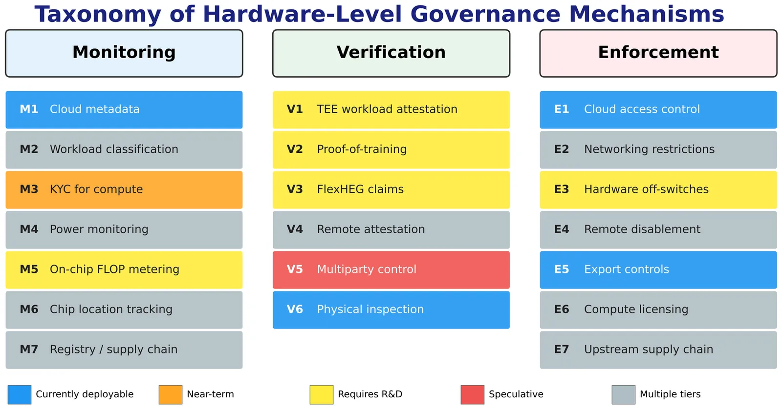 The governance of frontier AI increasingly relies on controlling access to computational resources, yet the hardware-level mechanisms invoked by policy proposals remain largely unexamined from an engineering perspective. This paper bridges the gap between AI governance and computer engineering by proposing a taxonomy of 20 hardware-level governance mechanisms, organised by function (monitoring, verification, enforcement) and assessed for technical feasibility on a four-point scale from currently deployable to speculative. For each mechanism, we provide a technical description, a feasibility rating, and an identification of adversarial vulnerabilities. We map the taxonomy onto four governance scenarios: domestic regulation, bilateral agreements, multilateral treaty verification, and industry self-regulation. Our analysis reveals a structural mismatch: the mechanisms most needed for treaty verification, including on-chip compute metering, cryptographic proof-of-training, and hardware-embedded enforcement, are also the least mature. We assess principal threats to compute-based governance, including algorithmic efficiency gains, distributed training methods, and sovereignty concerns. We identify a temporal constraint: the window during which semiconductor manufacturing concentration makes hardware-level governance implementable is narrowing, while R&D timelines for critical mechanisms span years. We present an adversary-tiered threat analysis distinguishing commercial, non-state, and nation-state actors, arguing the appropriate security standard is tamper-evident assurance analogous to IAEA verification rather than absolute tamper-proofing. The taxonomy, feasibility classification, and mechanism-to-scenario mapping provide a technical foundation for policymakers and identify the R&D investments required before hardware-level governance can support verifiable international agreements.