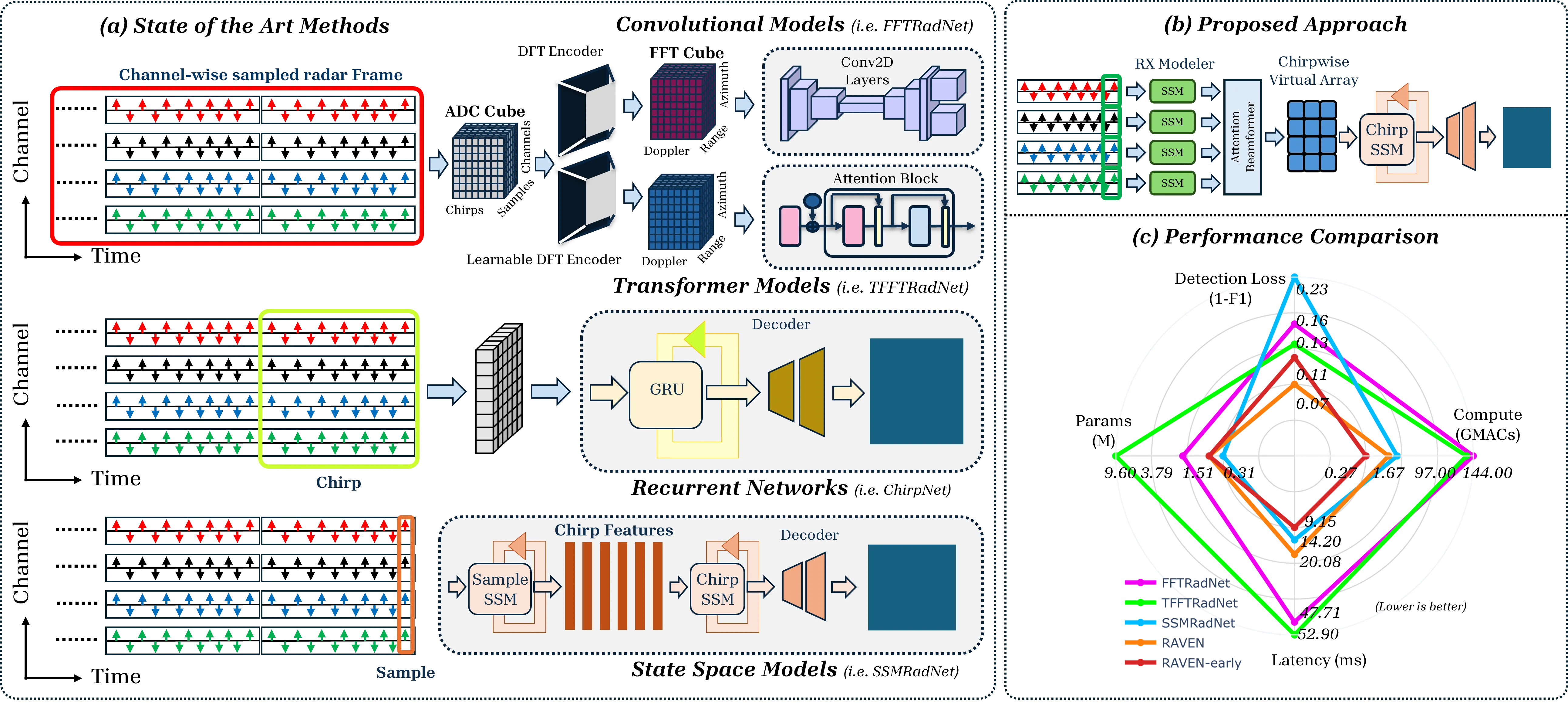 This paper presents RAVEN, a computationally efficient deep learning architecture for FMCW radar perception. The method processes raw ADC data in a chirp-wise streaming manner, preserves MIMO structure through independent receiver state-space encoders, and uses a learnable cross-antenna mixing module to recover compact virtual-array features. It also introduces an early-exit mechanism so the model can make decisions using only a subset of chirps when the latent state has stabilized. Across automotive radar benchmarks, the approach reports strong object detection and BEV free-space segmentation performance while substantially reducing computation and end-to-end latency compared with conventional frame-based radar pipelines.
