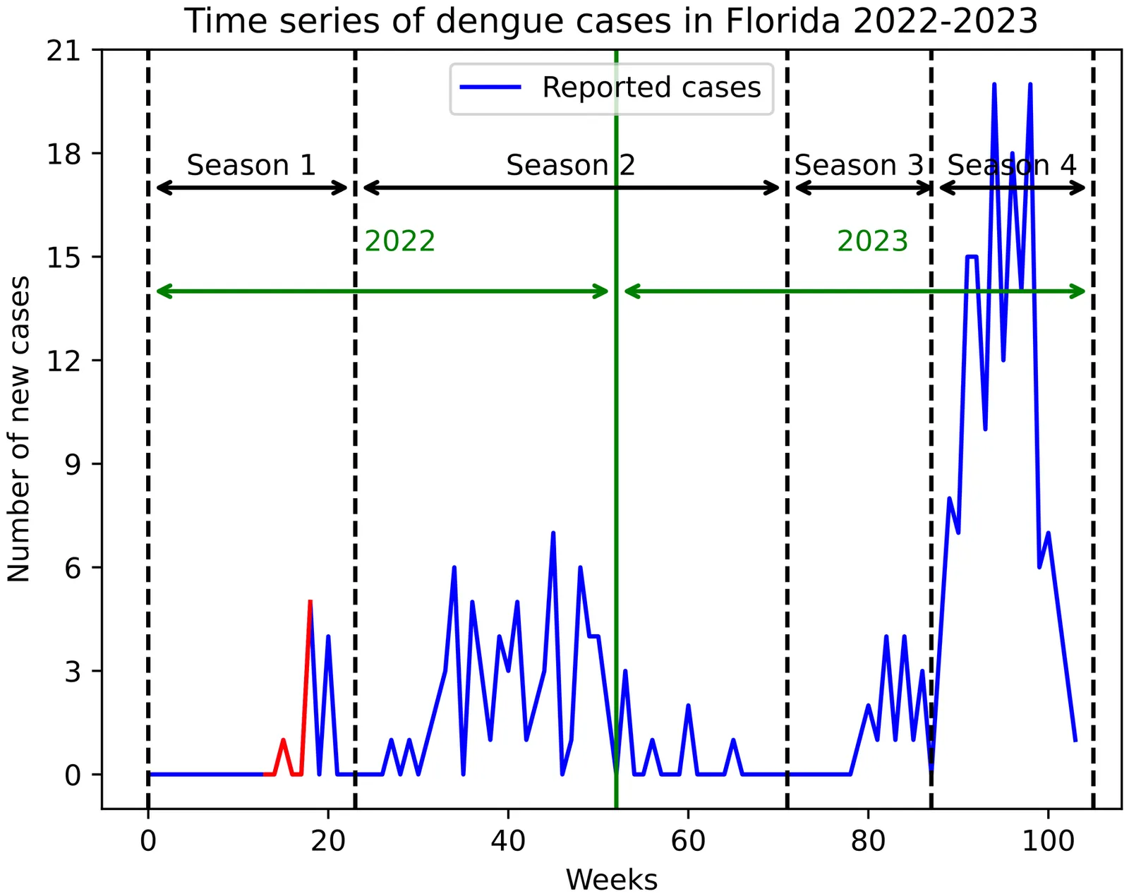 Reliable and timely dengue predictions provide actionable lead time for targeted vector control and clinical preparedness, reducing preventable diseases and health-system costs in at-risk communities. Dengue forecasting often relies on site-specific covariates and entomological data, limiting generalizability in data-sparse settings. We propose a data-parsimonious (DP) framework based on the incidence versus cumulative cases (ICC) curve, extending it from a basic SIR to a two-population SEIR model for dengue. Our DP model uses only the target season's incidence time series and estimates only two parameters, reducing noise and computational burden. A Bayesian extension quantifies the case reporting and fitting uncertainty to produce calibrated predictive intervals. We evaluated the performance of the DP model in the 2022-2023 outbreaks in Florida, where standardized clinical tests and reporting support accurate case determination. The DP framework demonstrates competitive predictive performance at substantially lower computational cost than more elaborate models, making it suitable for dengue early detection where dense surveillance or long historical records are unavailable.