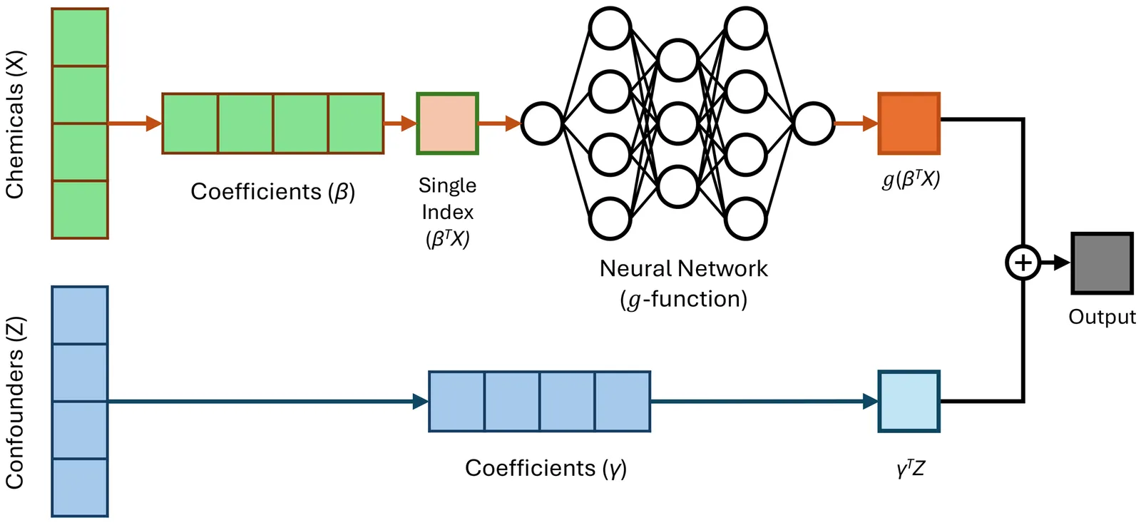Evaluating the health effects of complex environmental mixtures remains a central challenge in environmental health research. Existing approaches vary in their flexibility, interpretability, scalability, and support for diverse outcome types, often limiting their utility in real-world applications. To address these limitations, we propose a neural network-based partial-linear single-index (NeuralPLSI) modeling framework that bridges semiparametric regression modeling interpretability with the expressive power of deep learning. The NeuralPLSI model constructs an interpretable exposure index via a learnable projection and models its relationship with the outcome through a flexible neural network. The framework accommodates continuous, binary, and time-to-event outcomes, and supports inference through a bootstrap-based procedure that yields confidence intervals for key model parameters. We evaluated NeuralPLSI through simulation studies under a range of scenarios and applied it to data from the National Health and Nutrition Examination Survey (NHANES) to demonstrate its practical utility. Together, our contributions establish NeuralPLSI as a scalable, interpretable, and versatile modeling tool for mixture analysis. To promote adoption and reproducibility, we release a user-friendly open-source software package that implements the proposed methodology and supports downstream visualization and inference (\texttt{https://github.com/hyungrok-do/NeuralPLSI}).