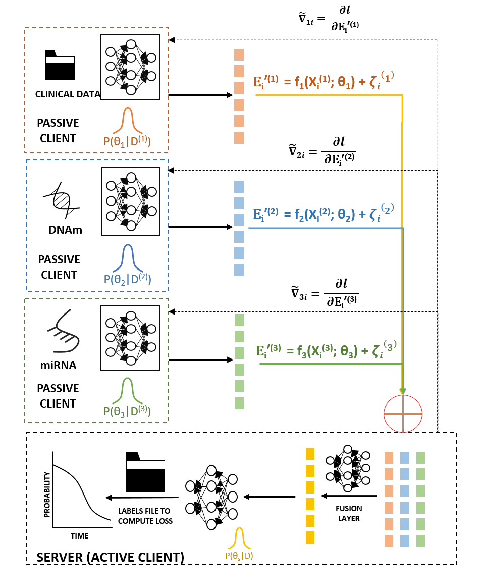 Multimodal time-to-event prediction often requires integrating sensitive data distributed across multiple parties, making centralized model training impractical due to privacy constraints. At the same time, most existing multimodal survival models produce single deterministic predictions without indicating how confident the model is in its estimates, which can limit their reliability in real-world decision making. To address these challenges, we propose BVFLMSP, a Bayesian Vertical Federated Learning (VFL) framework for multimodal time-to-event analysis based on a Split Neural Network architecture. In BVFLMSP, each client independently models a specific data modality using a Bayesian neural network, while a central server aggregates intermediate representations to perform survival risk prediction. To enhance privacy, we integrate differential privacy mechanisms by perturbing client side representations before transmission, providing formal privacy guarantees against information leakage during federated training. We first evaluate our Bayesian multimodal survival model against widely used single modality survival baselines and the centralized multimodal baseline MultiSurv. Across multimodal settings, the proposed method shows consistent improvements in discrimination performance, with up to 0.02 higher C-index compared to MultiSurv. We then compare federated and centralized learning under varying privacy budgets across different modality combinations, highlighting the tradeoff between predictive performance and privacy. Experimental results show that BVFLMSP effectively includes multimodal data, improves survival prediction over existing baselines, and remains robust under strict privacy constraints while providing uncertainty estimates.