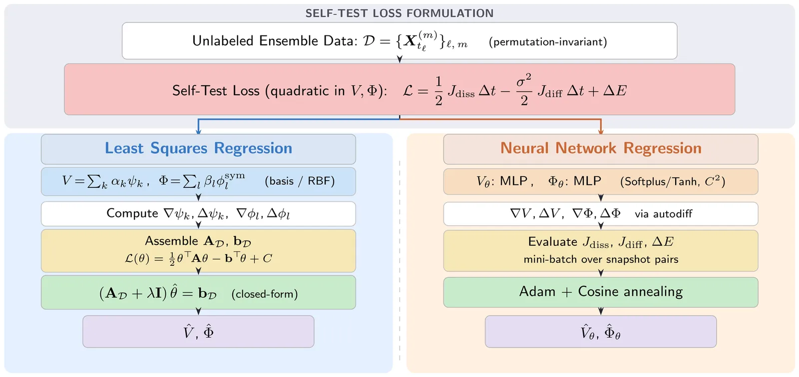 Learning the potentials of interacting particle systems is a fundamental task across various scientific disciplines. A major challenge is that unlabeled data collected at discrete time points lack trajectory information due to limitations in data collection methods or privacy constraints. We address this challenge by introducing a trajectory-free self-test loss function that leverages the weak-form stochastic evolution equation of the empirical distribution. The loss function is quadratic in potentials, supporting parametric and nonparametric regression algorithms for robust estimation that scale to large, high-dimensional systems with big data. Systematic numerical tests show that our method outperforms baseline methods that regress on trajectories recovered via label matching, tolerating large observation time steps. We establish the convergence of parametric estimators as the sample size increases, providing a theoretical foundation for the proposed approach.