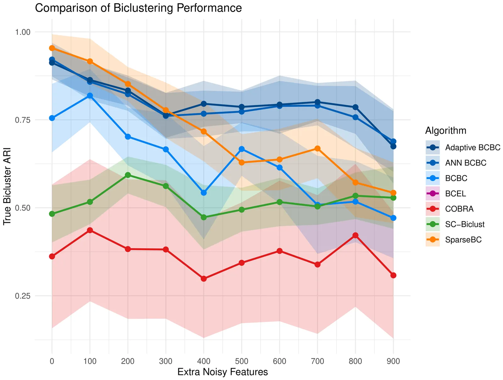 This article proposes a biconvex modification to convex biclustering in order to improve its performance in high-dimensional settings. In contrast to heuristics that discard a subset of noisy features a priori, our method jointly learns and accordingly weighs informative features while discovering biclusters. Moreover, the method is adaptive to the data, and is accompanied by an efficient algorithm based on proximal alternating minimization, complete with detailed guidance on hyperparameter tuning and efficient solutions to optimization subproblems. These contributions are theoretically grounded; we establish finite-sample bounds on the objective function under sub-Gaussian errors, and generalize these guarantees to cases where input affinities need not be uniform. Extensive simulation results reveal our method consistently recovers underlying biclusters while weighing and selecting features appropriately, outperforming peer methods. An application to a gene microarray dataset of lymphoma samples recovers biclusters matching an underlying classification, while giving additional interpretation to the mRNA samples via the column groupings and fitted weights.