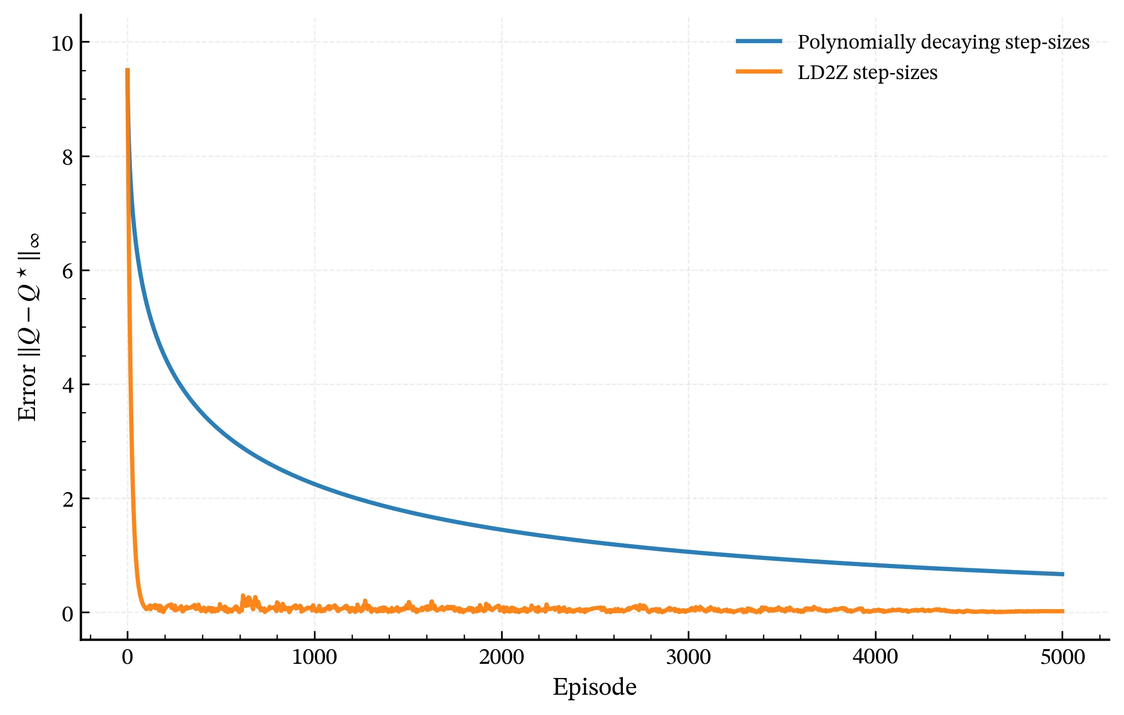 Despite the sustained popularity of Q-learning as a practical tool for policy determination, a majority of relevant theoretical literature deals with either constant ($η_{t}\equiv η$) or polynomially decaying ($η_{t} = ηt^{-α}$) learning schedules. However, it is well known that these choices suffer from either persistent bias or prohibitively slow convergence. In contrast, the recently proposed linear decay to zero (\texttt{LD2Z}: $η_{t,n}=η(1-t/n)$) schedule has shown appreciable empirical performance, but its theoretical and statistical properties remain largely unexplored, especially in the Q-learning setting. We address this gap in the literature by first considering a general class of power-law decay to zero (\texttt{PD2Z}-$ν$: $η_{t,n}=η(1-t/n)^ν$). Proceeding step-by-step, we present a sharp non-asymptotic error bound for Q-learning with \texttt{PD2Z}-$ν$ schedule, which then is used to derive a central limit theory for a new \textit{tail} Polyak-Ruppert averaging estimator. Finally, we also provide a novel time-uniform Gaussian approximation (also known as \textit{strong invariance principle}) for the partial sum process of Q-learning iterates, which facilitates bootstrap-based inference. All our theoretical results are complemented by extensive numerical experiments. Beyond being new theoretical and statistical contributions to the Q-learning literature, our results definitively establish that \texttt{LD2Z} and in general \texttt{PD2Z}-$ν$ achieve a best-of-both-worlds property: they inherit the rapid decay from initialization (characteristic of constant step-sizes) while retaining the asymptotic convergence guarantees (characteristic of polynomially decaying schedules). This dual advantage explains the empirical success of \texttt{LD2Z} while providing practical guidelines for inference through our results.
