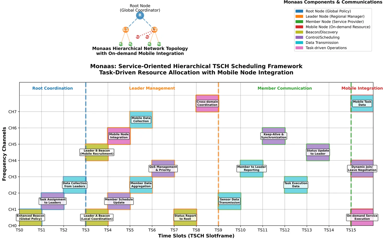 The Time-Slotted Channel Hopping (TSCH) mode of IEEE802.15.4 standard provides ultra high end-to-end reliability and low-power consumption for application in field of Industrial Internet of Things (IIoT). With the evolving of Industrial 4.0, dynamic and bursty tasks with varied Quality of Service (QoS); effective management and utilization of growing number of mobile equipments become two major challenges for network solutions. The existing TSCH-based networks lack of a system framework design to handle these challenges. In this paper, we propose a novel, service-oriented, and hierarchical IoT network architecture named Mobile Node as a Service (Monaas). Monaas aims to systematically manage and schedule mobile nodes as on-demand, elastic resources through a new architectural design and protocol mechanisms. Its core features include a hierarchical architecture to balance global coordination with local autonomy, task-driven scheduling for proactive resource allocation, and an on-demand mobile resource integration mechanism. The feasibility and potential of the Monaas link layer mechanisms are validated through implementation and performance evaluation on an nRF52840 hardware testbed, demonstrating its potential advantages in specific scenarios. On a physical nRF52840 testbed, Monaas consistently achieved a Task Completion Rate (TCR) above 98% for high-priority tasks under bursty traffic and link degradation, whereas all representative baselines (Static TSCH, 6TiSCH Minimal, OST, FTS-SDN) remained below 40%.Moreover, its on-demand mobile resource integration activated services in 1.2 s, at least 65% faster than SDN (3.5 s) and OST/6TiSCH (> 5.8 s).