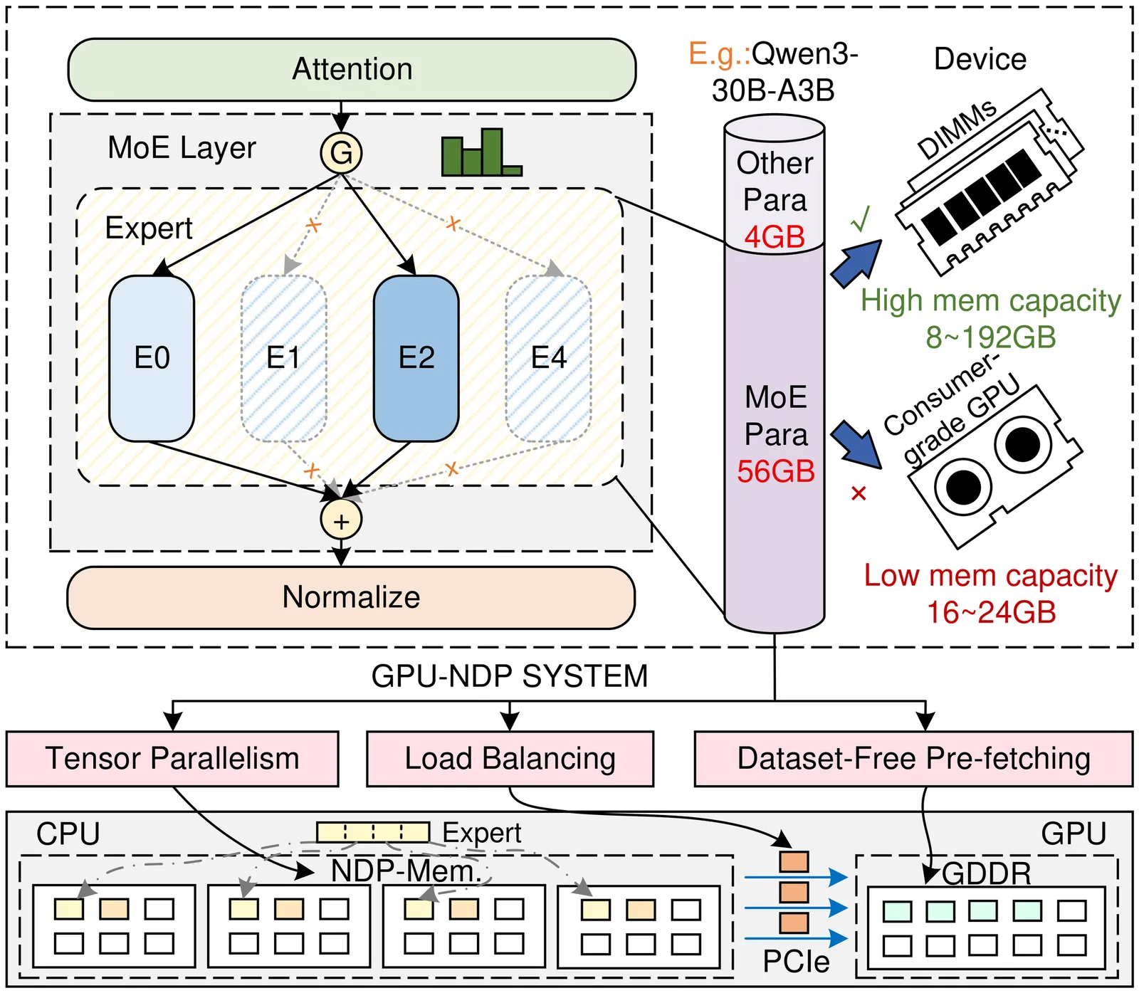 Mixture-of-Experts (MoE) models facilitate edge deployment by decoupling model capacity from active computation, yet their large memory footprint drives the need for GPU systems with near-data processing (NDP) capabilities that offload experts to dedicated processing units. However, deploying MoE models on such edge-based GPU-NDP systems faces three critical challenges: 1) severe load imbalance across NDP units due to non-uniform expert selection and expert parallelism, 2) insufficient GPU utilization during expert computation within NDP units, and 3) extensive data pre-profiling necessitated by unpredictable expert activation patterns for pre-fetching. To address these challenges, this paper proposes an efficient inference framework featuring three key optimizations. First, the underexplored tensor parallelism in MoE inference is exploited to partition and compute large expert parameters across multiple NDP units simultaneously towards edge low-batch scenarios. Second, a load-balancing-aware scheduling algorithm distributes expert computations across NDP units and GPU to maximize resource utilization. Third, a dataset-free pre-fetching strategy proactively loads frequently accessed experts to minimize activation delays. Experimental results show that our framework enables GPU-NDP systems to achieve 2.41x on average and up to 2.56x speedup in end-to-end latency compared to state-of-the-art approaches, significantly enhancing MoE inference efficiency in resource-constrained environments.