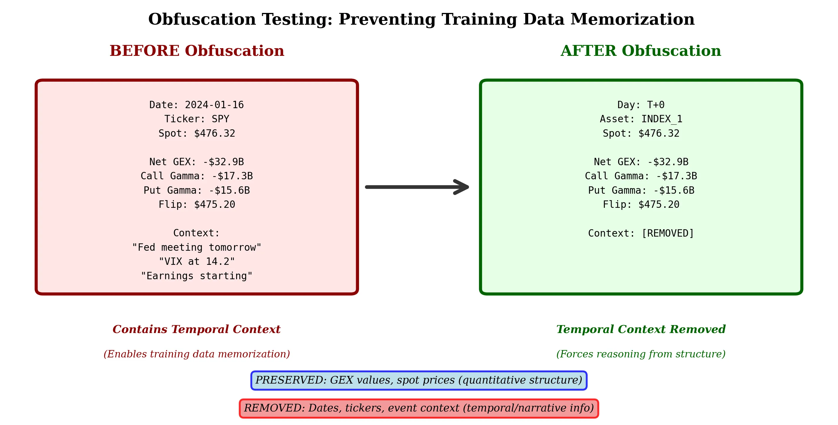 We introduce obfuscation testing, a novel methodology for validating whether large language models detect structural market patterns through causal reasoning rather than temporal association. Testing three dealer hedging constraint patterns (gamma positioning, stock pinning, 0DTE hedging) on 242 trading days (95.6% coverage) of S&P 500 options data, we find LLMs achieve 71.5% detection rate using unbiased prompts that provide only raw gamma exposure values without regime labels or temporal context. The WHO-WHOM-WHAT causal framework forces models to identify the economic actors (dealers), affected parties (directional traders), and structural mechanisms (forced hedging) underlying observed market dynamics. Critically, detection accuracy (91.2%) remains stable even as economic profitability varies quarterly, demonstrating that models identify structural constraints rather than profitable patterns. When prompted with regime labels, detection increases to 100%, but the 71.5% unbiased rate validates genuine pattern recognition. Our findings suggest LLMs possess emergent capabilities for detecting complex financial mechanisms through pure structural reasoning, with implications for systematic strategy development, risk management, and our understanding of how transformer architectures process financial market dynamics.