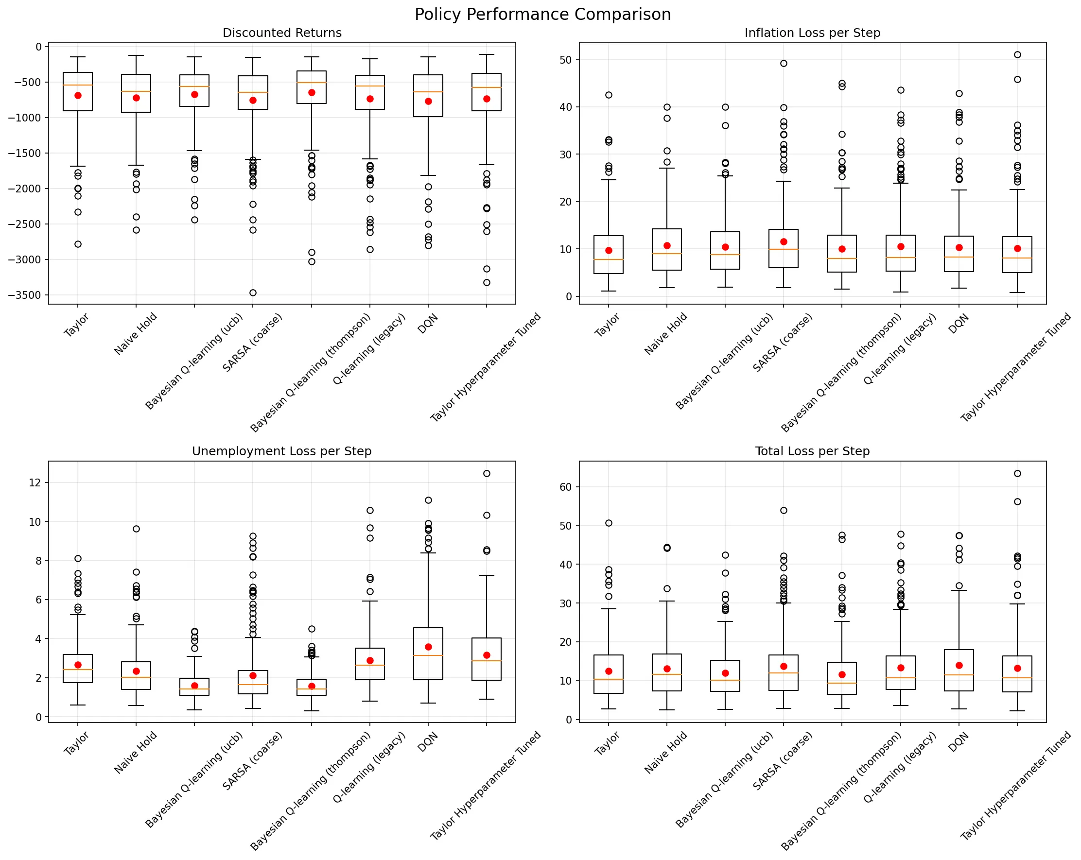 We study how a central bank should dynamically set short-term nominal interest rates to stabilize inflation and unemployment when macroeconomic relationships are uncertain and time-varying. We model monetary policy as a sequential decision-making problem where the central bank observes macroeconomic conditions quarterly and chooses interest rate adjustments. Using publically accessible historical Federal Reserve Economic Data (FRED), we construct a linear-Gaussian transition model and implement a discrete-action Markov Decision Process with a quadratic loss reward function. We chose to compare nine different reinforcement learning style approaches against Taylor Rule and naive baselines, including tabular Q-learning variants, SARSA, Actor-Critic, Deep Q-Networks, Bayesian Q-learning with uncertainty quantification, and POMDP formulations with partial observability. Surprisingly, standard tabular Q-learning achieved the best performance (-615.13 +- 309.58 mean return), outperforming both enhanced RL methods and traditional policy rules. Our results suggest that while sophisticated RL techniques show promise for monetary policy applications, simpler approaches may be more robust in this domain, highlighting important challenges in applying modern RL to macroeconomic policy.